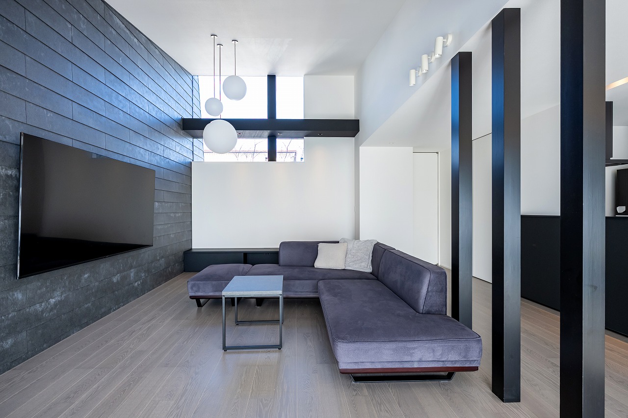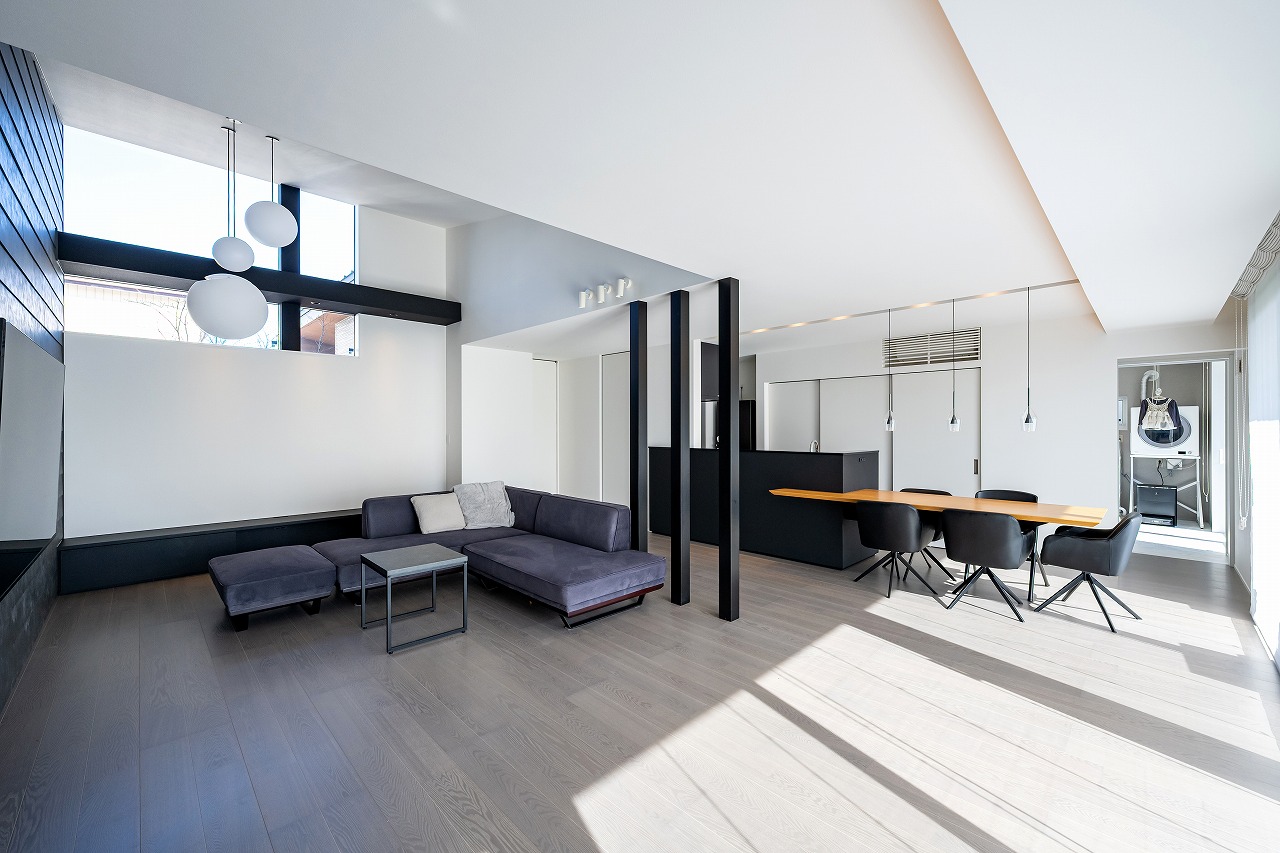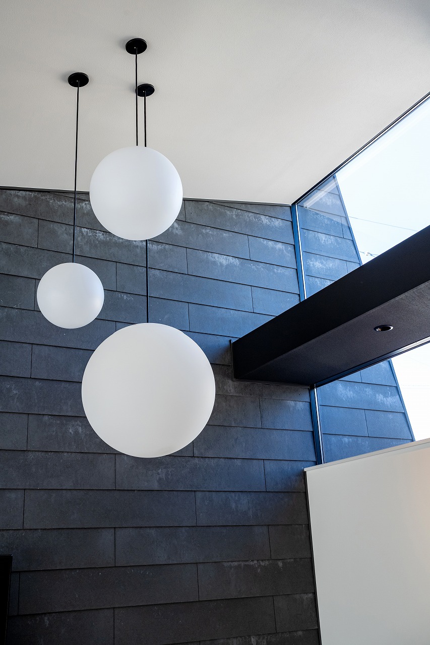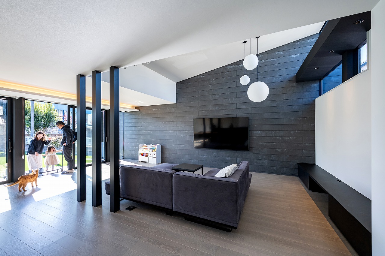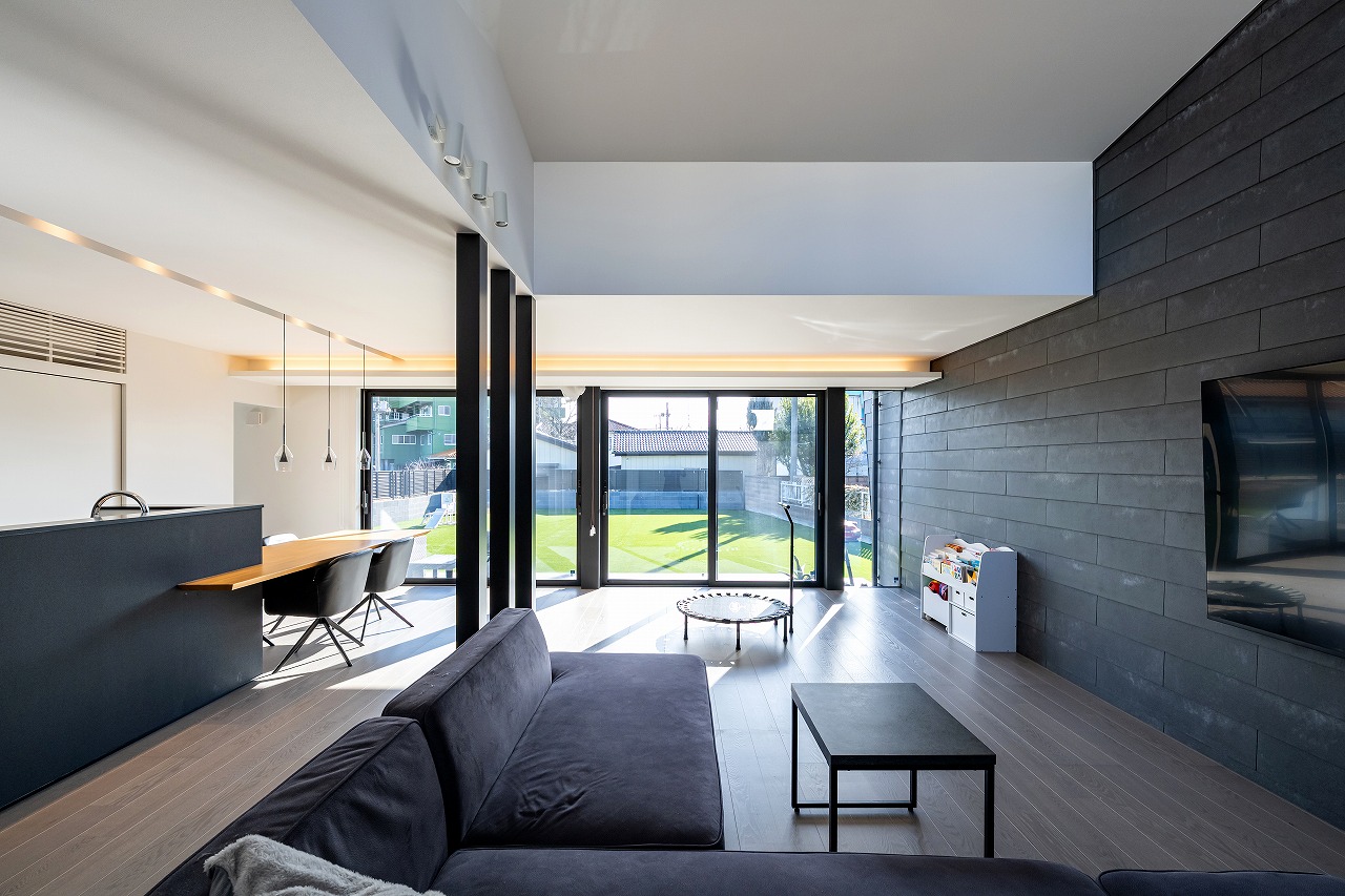 広大な土地を生かして広々としたお庭に建つ平屋のT様邸。室内と外がつながる開放的な設計が魅力で、リビングと庭をつなぐ大きな窓からはBBQや猫ちゃんが日向ぼっこをする様子が広がります。デザイン面では室内外ともにモダンな雰囲気で統一。植栽や木目の天井、ペンダントライトなどをアクセントにスタイリッシュな雰囲気に仕上げました。さらにリビングの壁は外壁と同じ素材を使用することで視線が抜け、まるで外と中が一体化したような開放感を演出します。他にも、キッチンとダイニングの横並び配置や贅沢な回遊動線、ファミリークローゼット隣接のランドリールームなど、家事のしやすさにもこだわった暮らしやすく魅力あふれる住まいです。