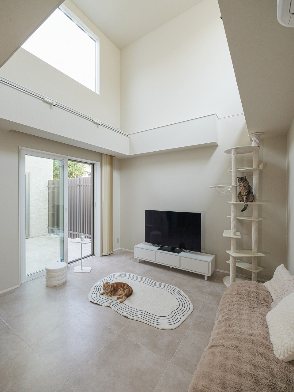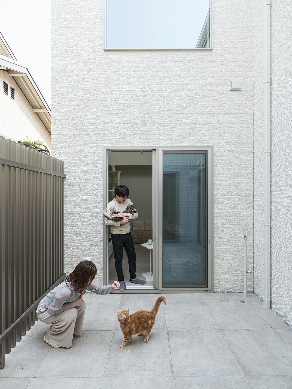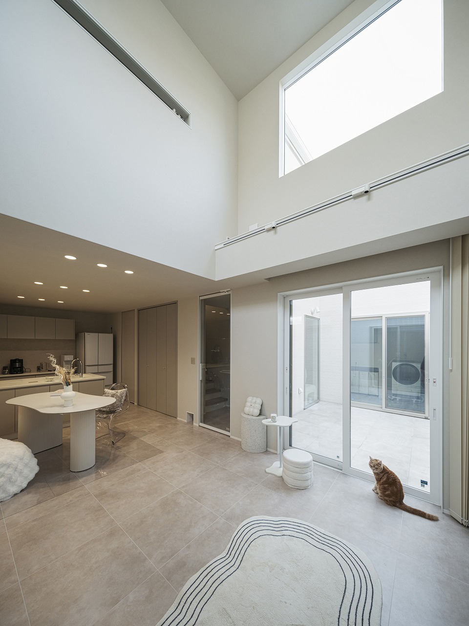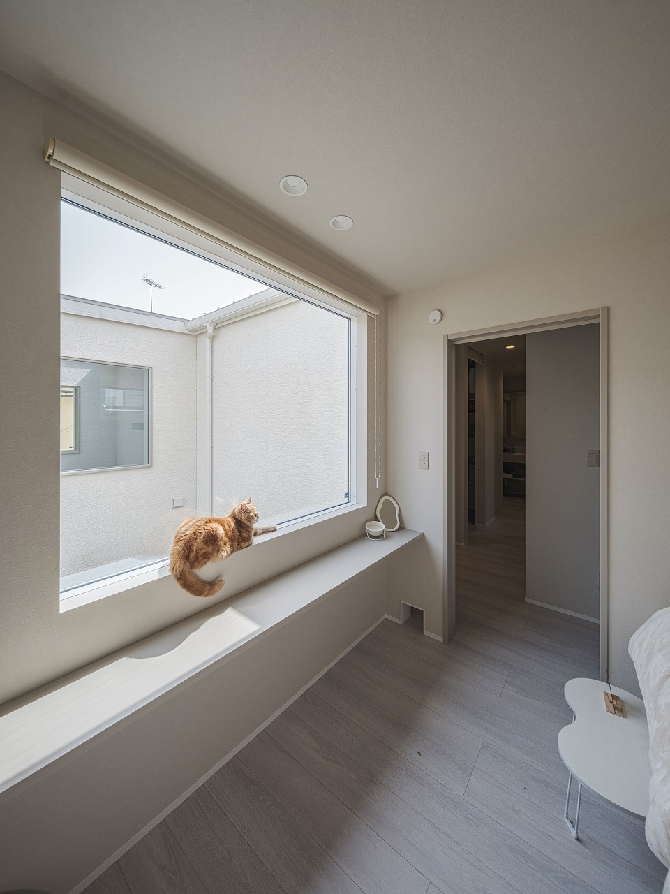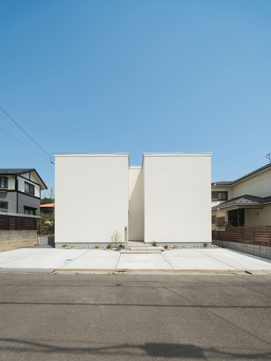 外から室内の様子が一切見えないH様邸。 中庭を設けたコの字型の間取りは完全プライベートな中庭だけではなく各箇所に光を注ぐので部屋全体が明るく開放的に。昼夜問わず外部の目を気にせず寛げる、自分たちだけの空間がたっぷりのお家です。 また、他にも大きな吹き抜けや収納、猫ちゃん専用の扉や道など、人間も猫も快適に過ごせる工夫が多数。外からの視線を気にせず、心からリラックスできるご家族だけのとっておきの住まいです。