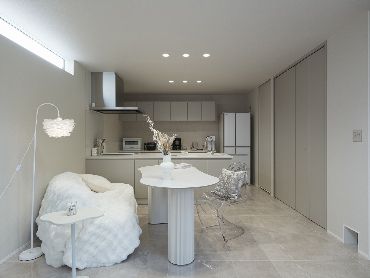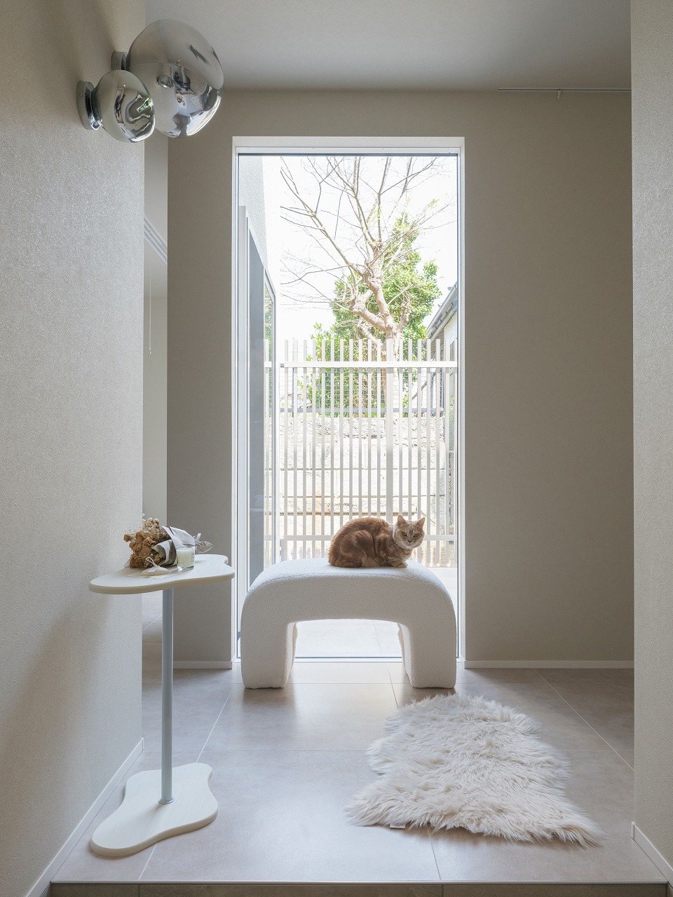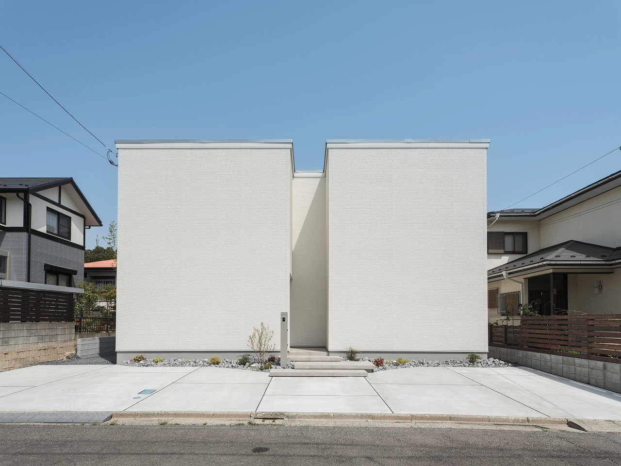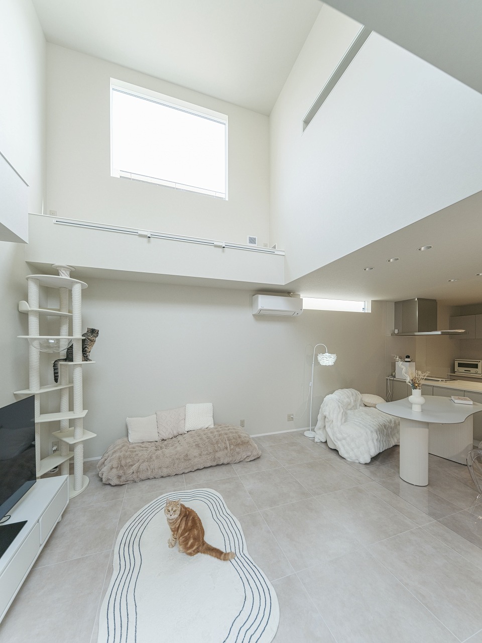 外から室内の様子が一切見えないH様邸。 中庭を設けたコの字型の間取りは完全プライベートな中庭だけではなく各箇所に光を注ぐので部屋全体が明るく開放的に。昼夜問わず外部の目を気にせず寛げる、自分たちだけの空間がたっぷりのお家です。 また、他にも大きな吹き抜けや収納、猫ちゃん専用の扉や道など、人間も猫も快適に過ごせる工夫が多数。外からの視線を気にせず、心からリラックスできるご家族だけのとっておきの住まいです。