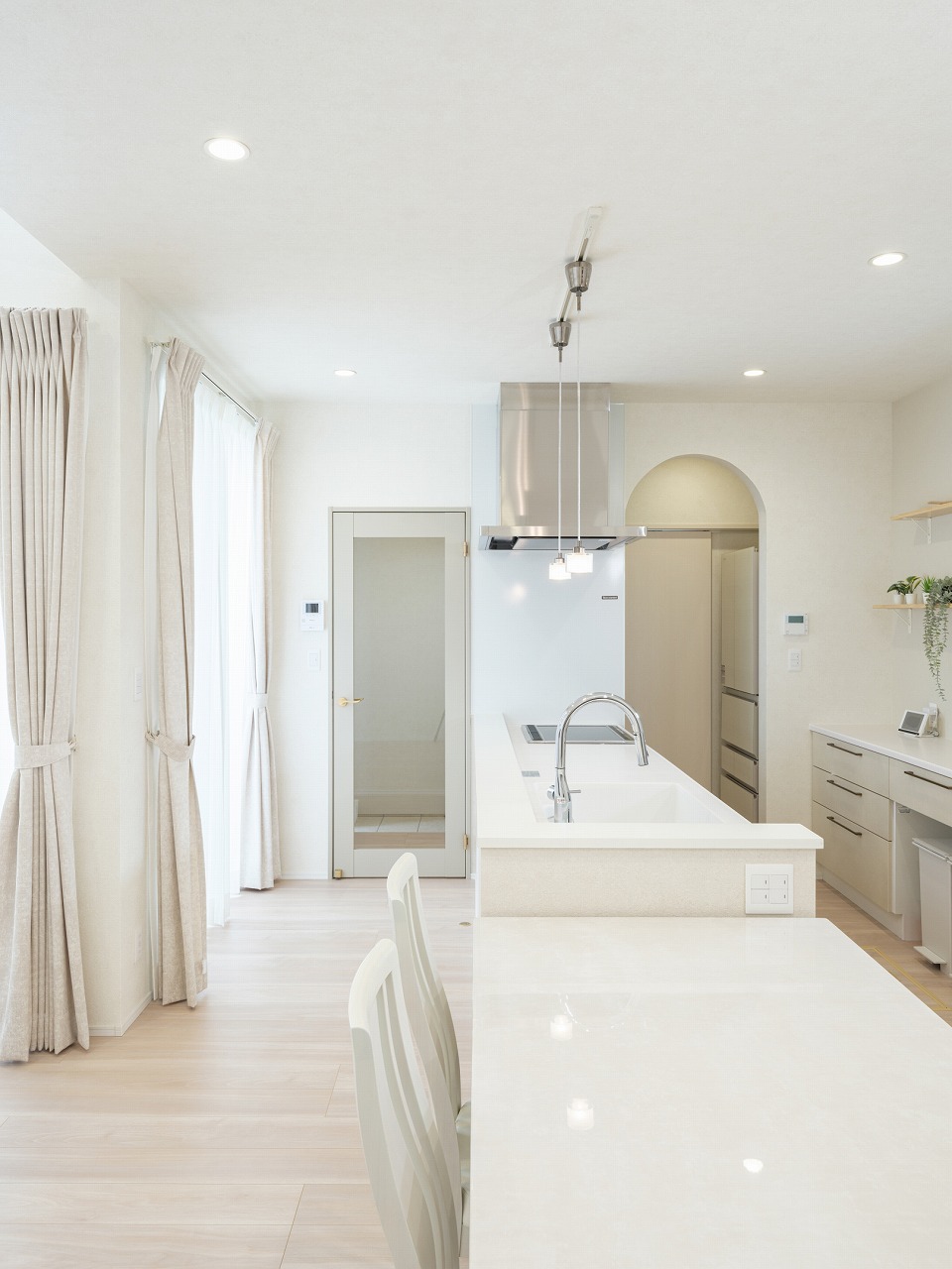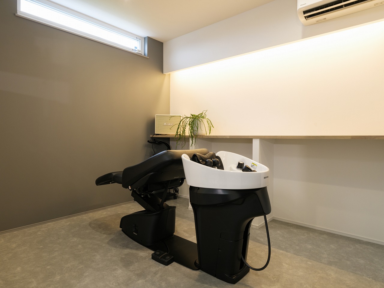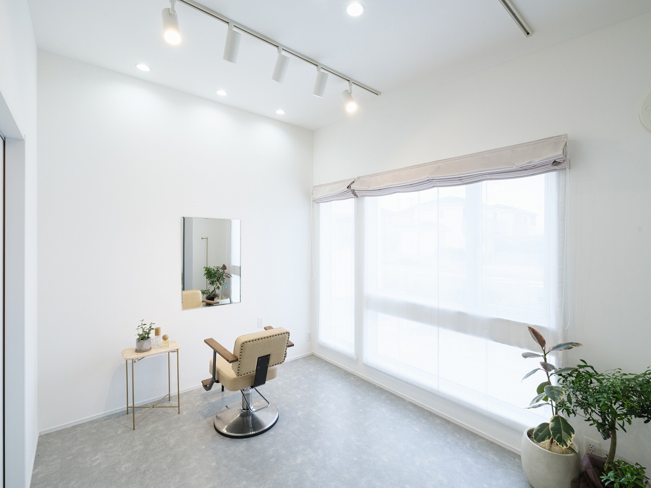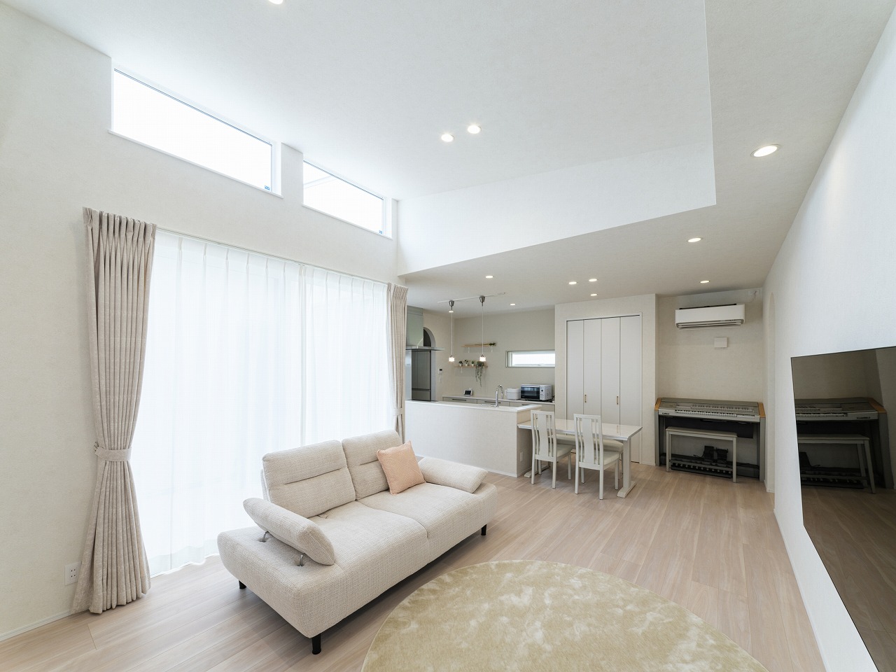 また、リビングと美容室のどちらにも勾配天井を採用し、視線が上へと抜ける開放感のある空間に。白を基調とした明るい室内に自然光がやさしく広がり、サロンとしても住まいとしても心地よい時間を演出します。