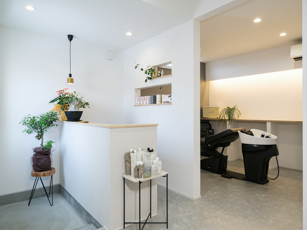 ホワイトを基調とした内装で、美容室としての清潔感と、住まいとしての落ち着きを両立した店舗併用住宅です。サロン空間と居住空間は内部でつながっており、必要に応じてスムーズに行き来できる設計。一方で、来店用と住居用の入口(玄関)はそれぞれ分けることで、プライベートと仕事のメリハリをしっかり確保しています。