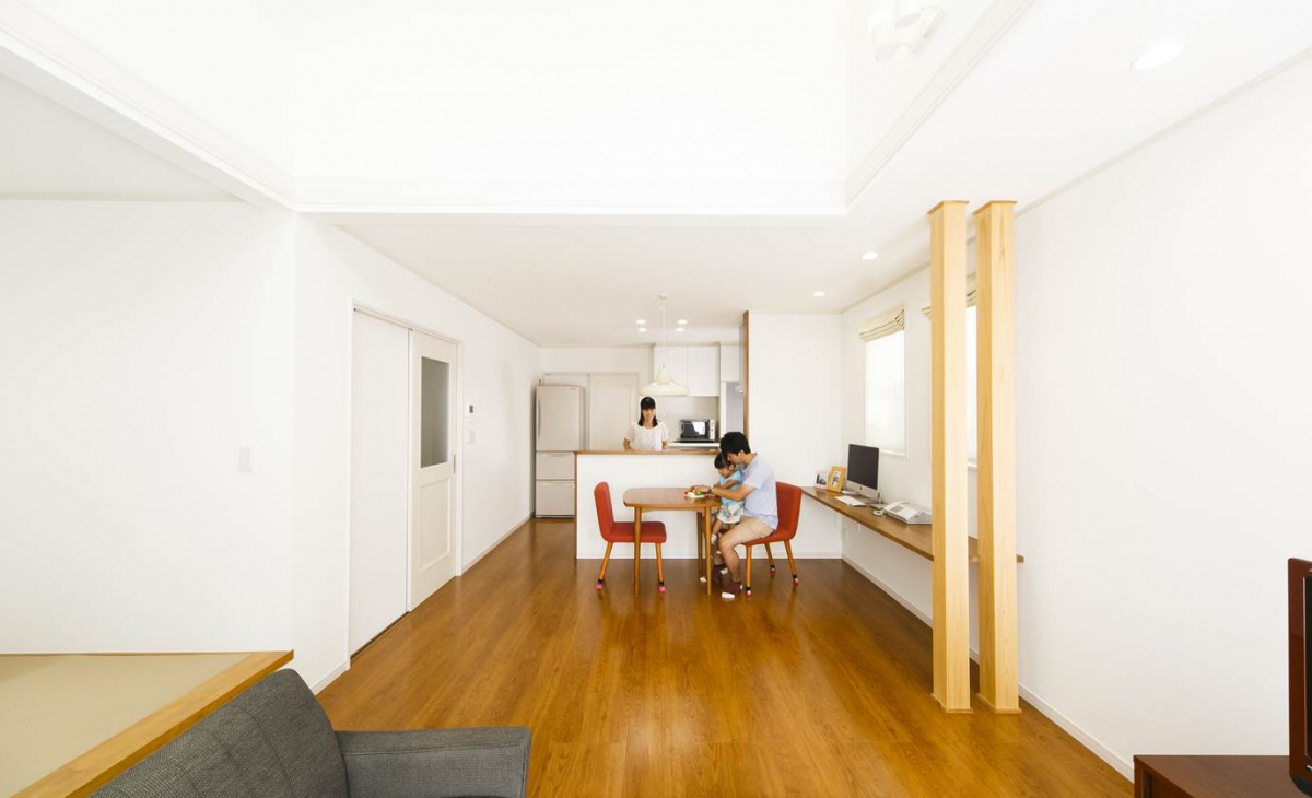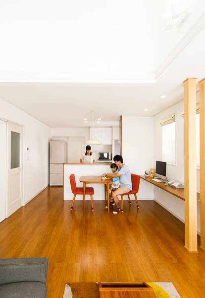 延床面積:104.3㎡(31.55坪) 家族構成:ご夫婦&お子様1人 「子どもとこれから作る想い出の舞台は、広く明るい我が家がいい」その想いからLDKを高天井にする必要があり、中2階にストック収納を設けました。実際にストック収納を使ってみると収納豊富でゆとりが生まれるのはもちろん、2階の音が響かない、近隣の家と視線の高さが合わないので、プライベート感が保たれるといったメリットも実感しています。