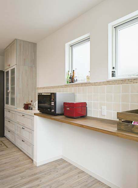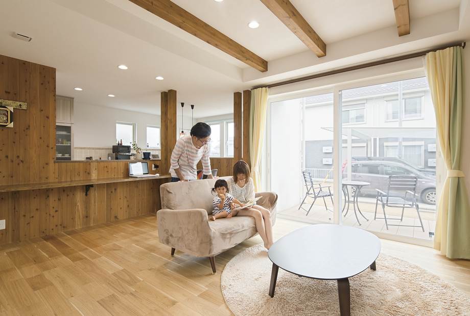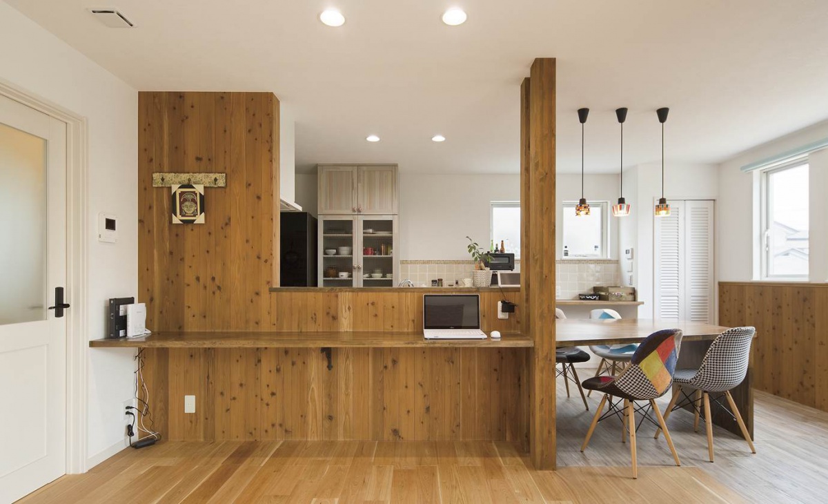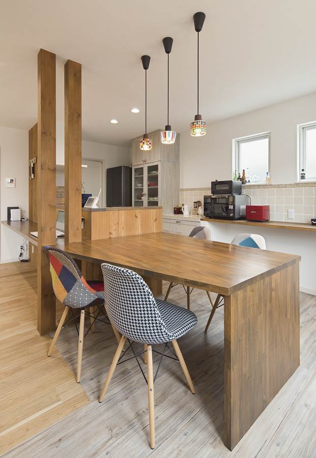 延床面積:143.25㎡(43.3坪) 家族構成:ご夫婦&お子様1人 可愛すぎないシンプルな家をテーマにした木の温もりを感じる家は、無垢材やレンガなど自然素材を取り入れ、デザイン性と快適性を両立させました。