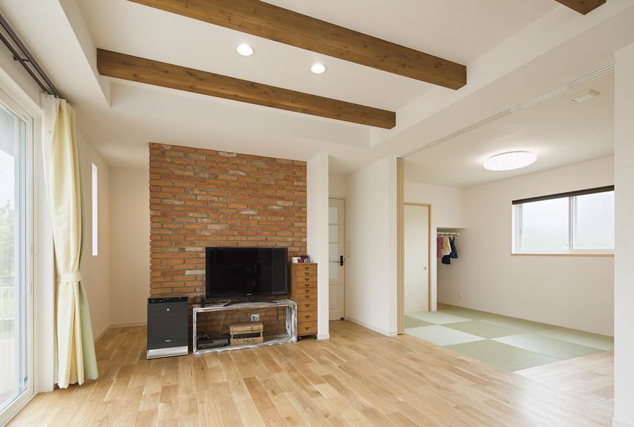 施主様の要望で採用したレンガ壁はLDKのアクセントに。