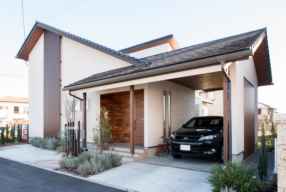 異なる角度で構成された屋根や家と一体となったガレージ。