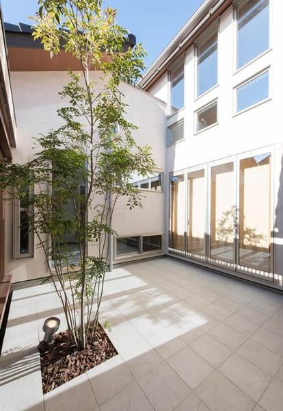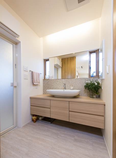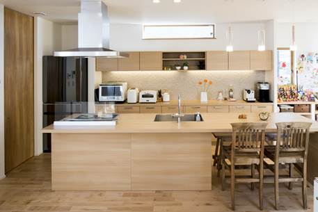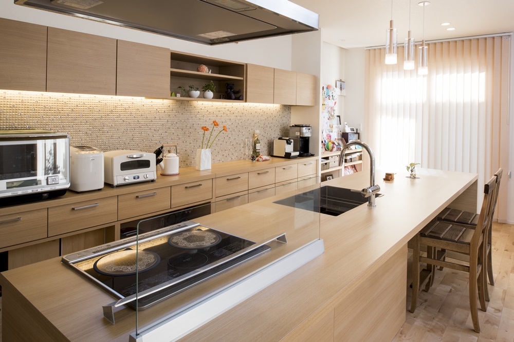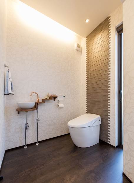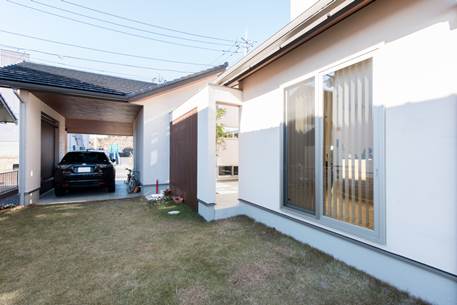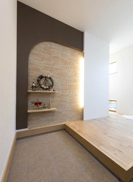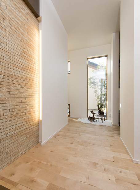 玄関ドアをはさんで左右非対称な形に広がる外観デザインが個性的なN様邸。内部もこだわりと心地よさに満ちた住空間が広がる施主さまの要望を美しく昇華させた住まいです。