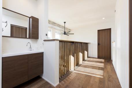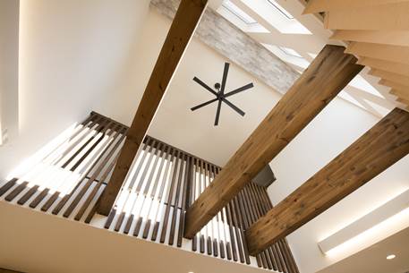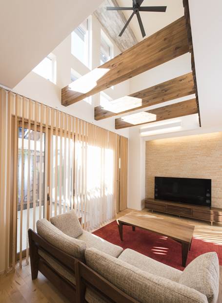 高い吹き抜けに配された古材風の梁がアクセント。