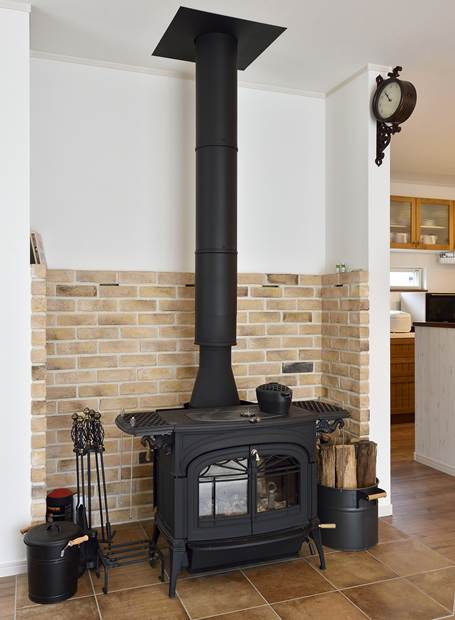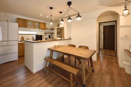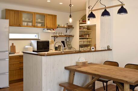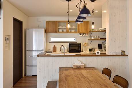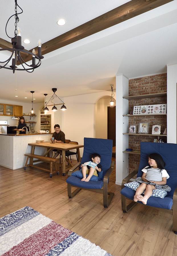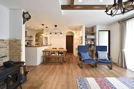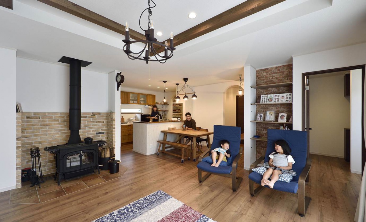おしゃれな山小屋がコンセプトのLDK。奥様お気に入りのカントリー調のキッチンや、床材•インテリアなど木材が映えるナチュラルなデザインで統一されています。冬場は部屋の中央に位置する薪ストーブが、やわらかな温もりで家族を集めます。