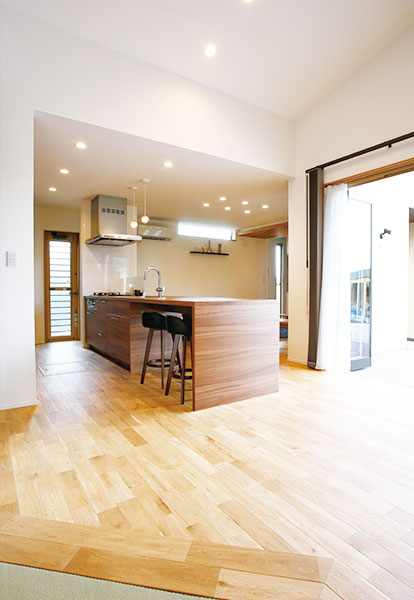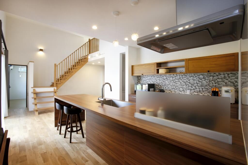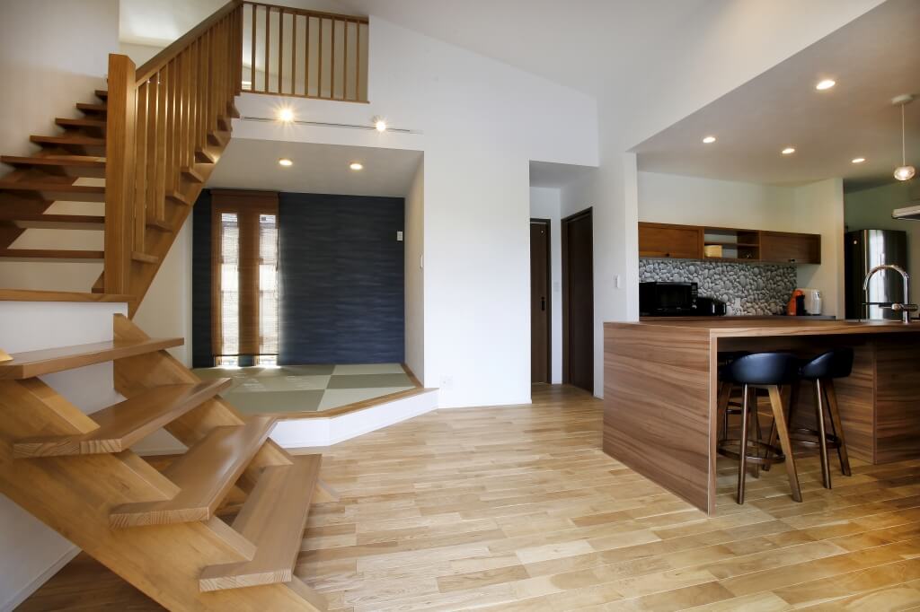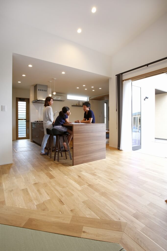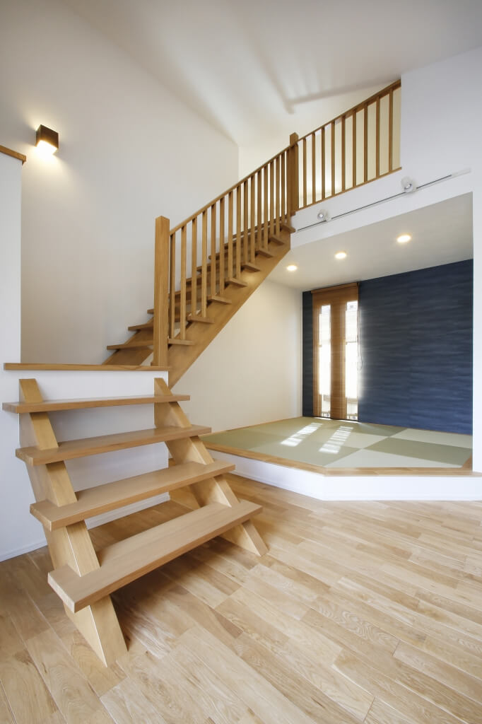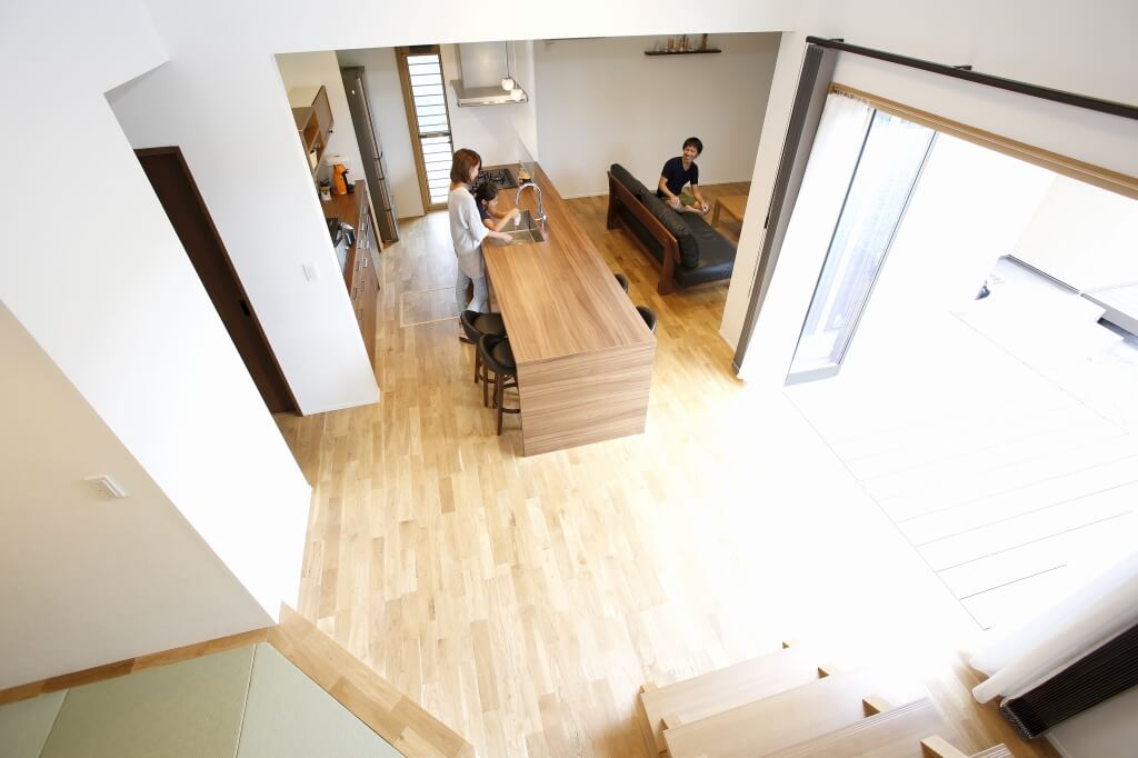 当初ご夫婦で平屋を計画していらっしゃいましたが、お子さまたちは「階段のある家」に住みたいと希望。そこで屋根の勾配を活かした階段と収納スペースを設けるプランを提案。大開口の窓と高天井による解放感が心地良い、双方が納得する理想の住まいが実現しました。