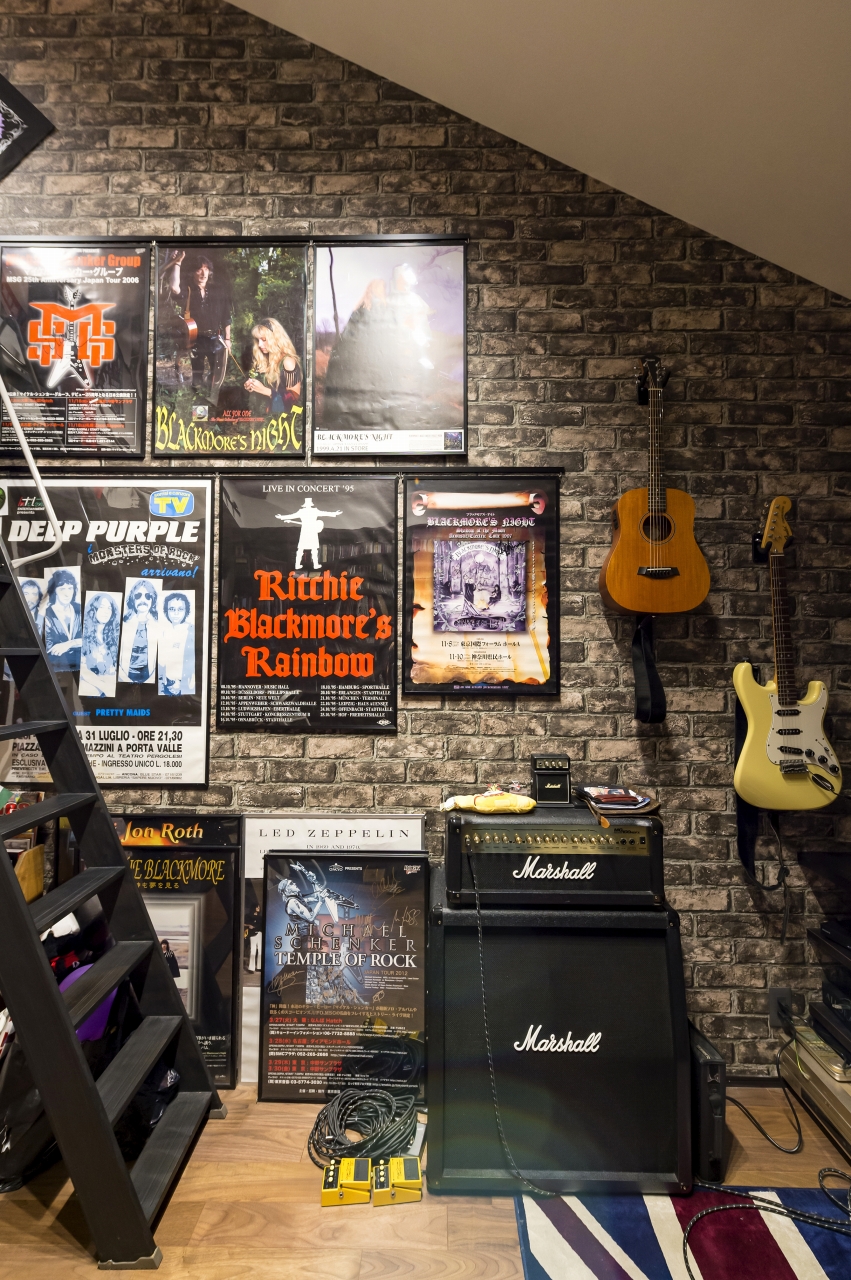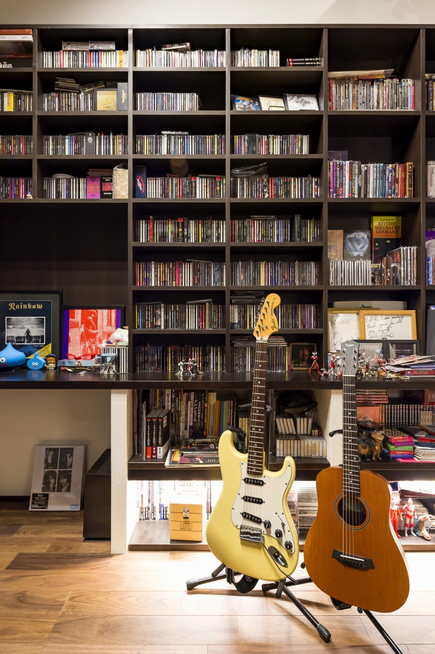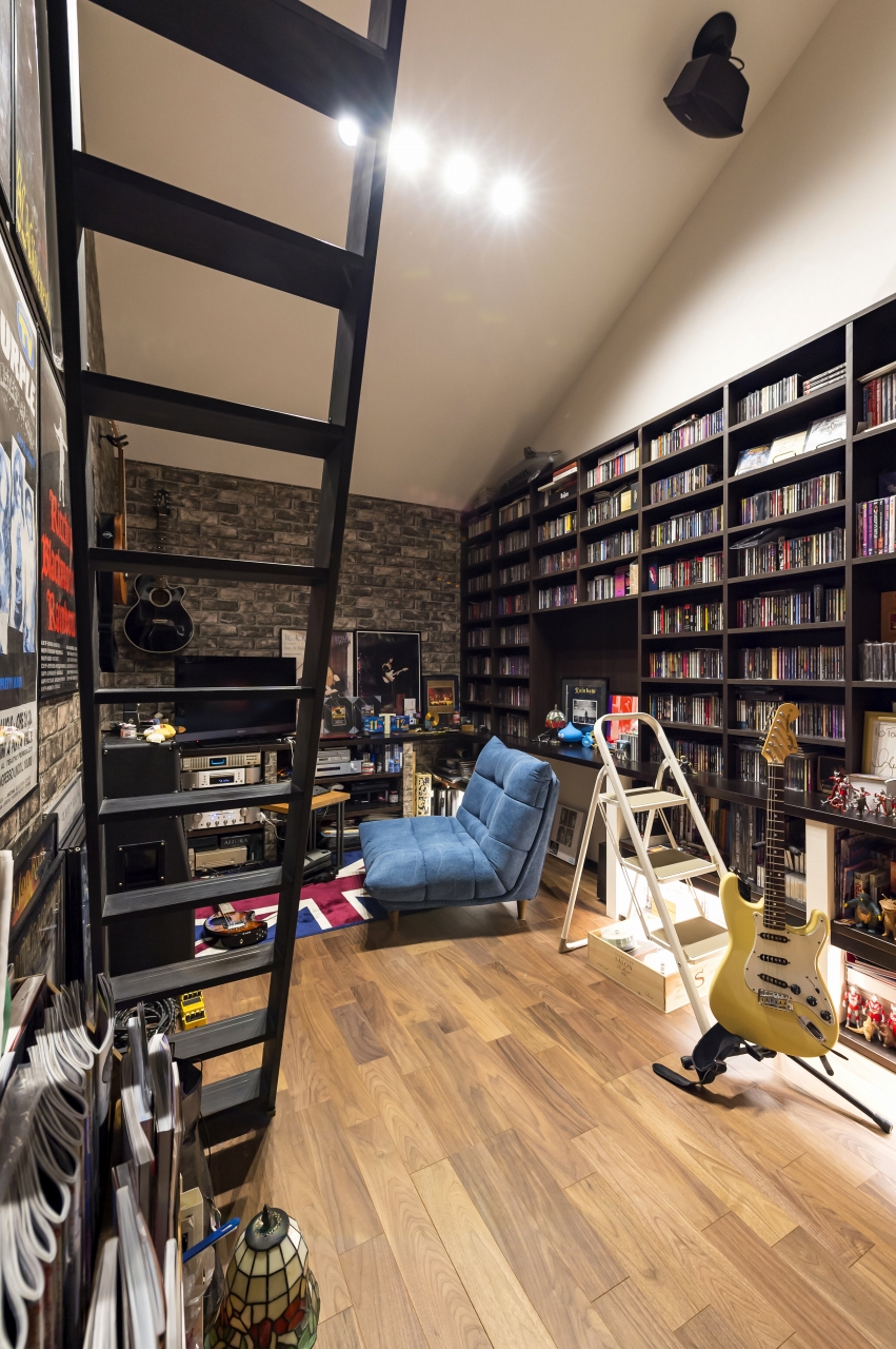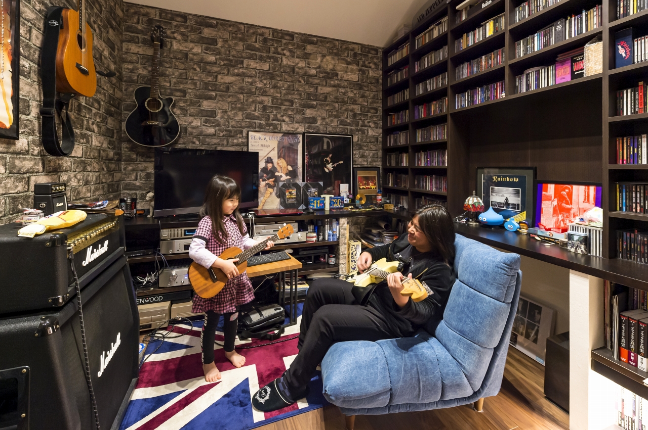 自由設計ならではのこだわりが詰まったS様邸。壁一面に趣味のCDや雑誌を収納しつつ、ポスターやギターを飾り、趣味を前面に打ち出したスペースを実現させたご主人。1Fに念願のネイルサロンをオープンさせた奥様。リビングは家族全員が落ち着いて過ごせる団らんの場所です。