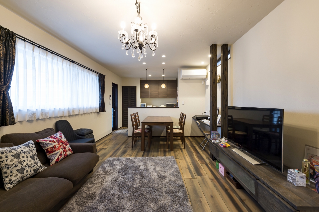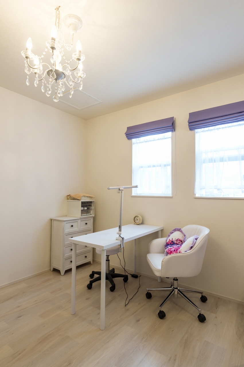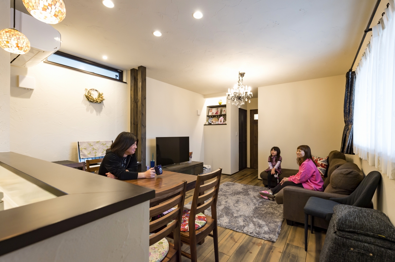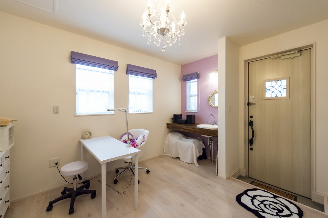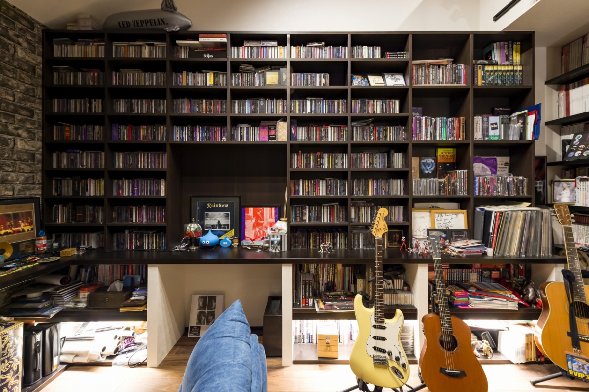 自由設計ならではのこだわりが詰まったS様邸。壁一面に趣味のCDや雑誌を収納しつつ、ポスターやギターを飾り、趣味を前面に打ち出したスペースを実現させたご主人。1Fに念願のネイルサロンをオープンさせた奥様。リビングは家族全員が落ち着いて過ごせる団らんの場所です。