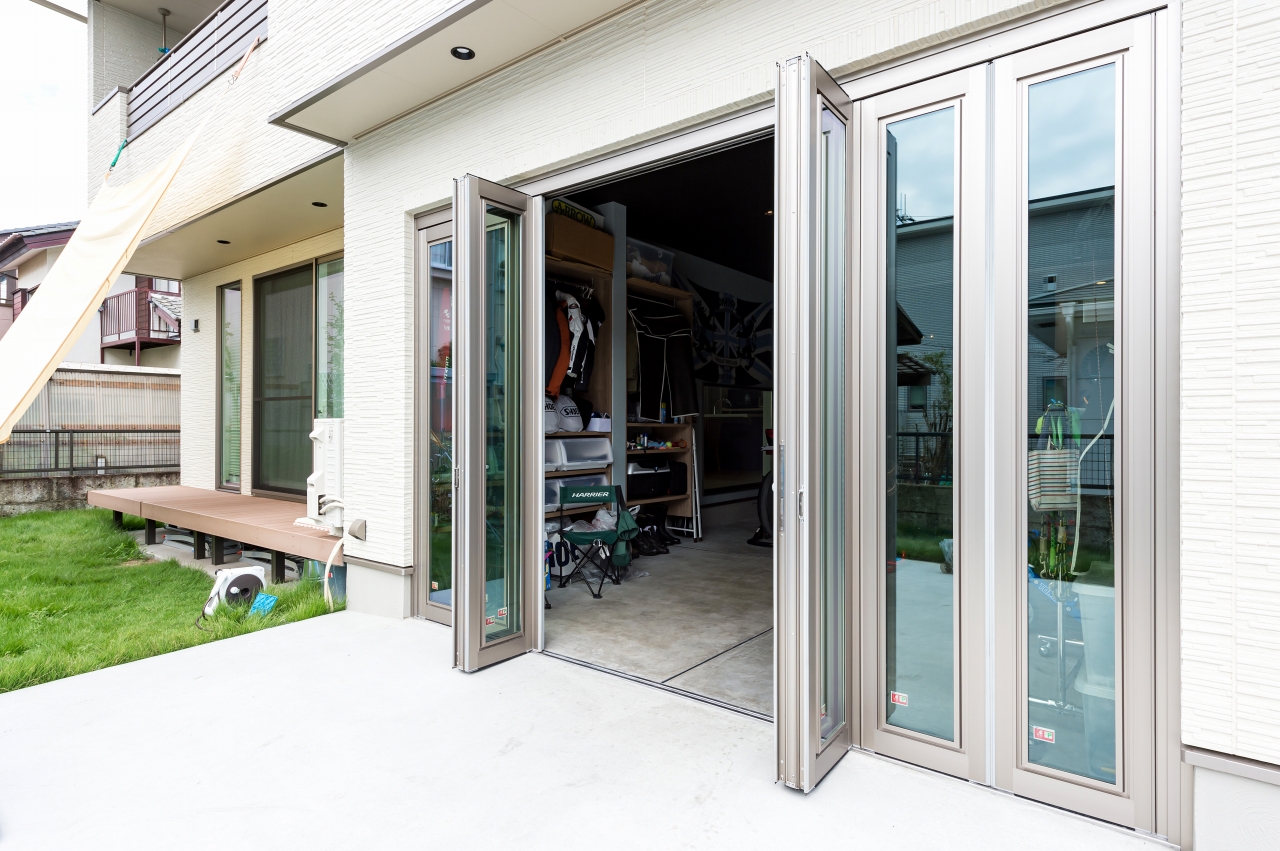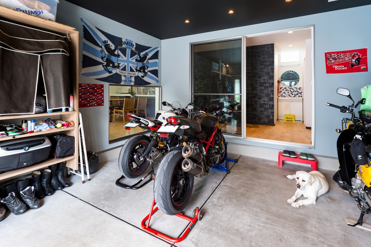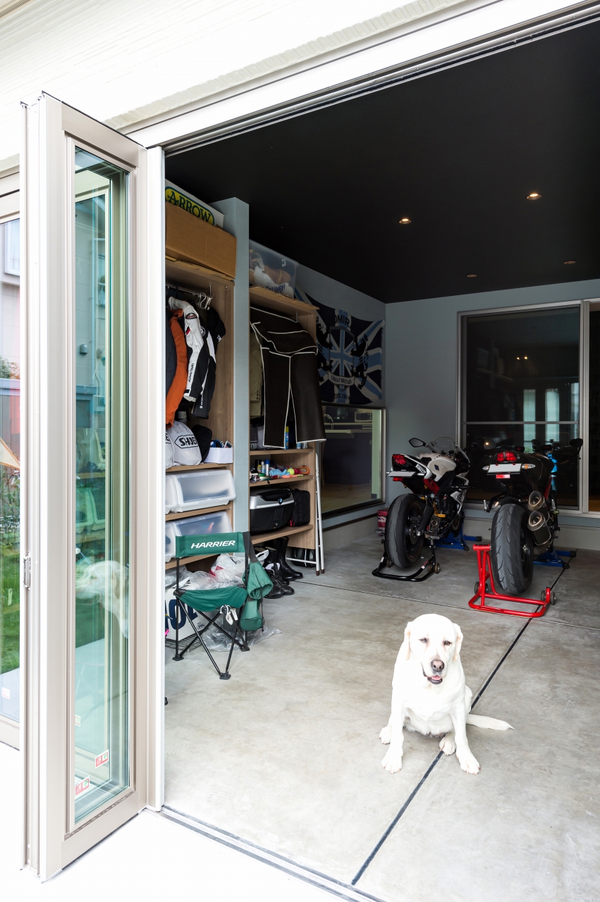 充分な広さを確保し、店舗のような収納力のガレージ