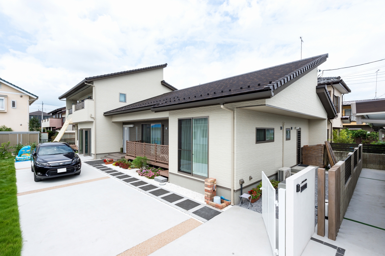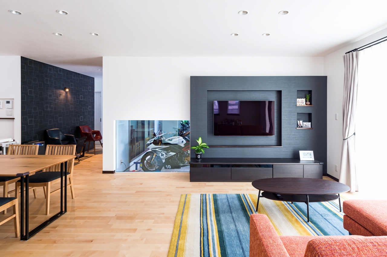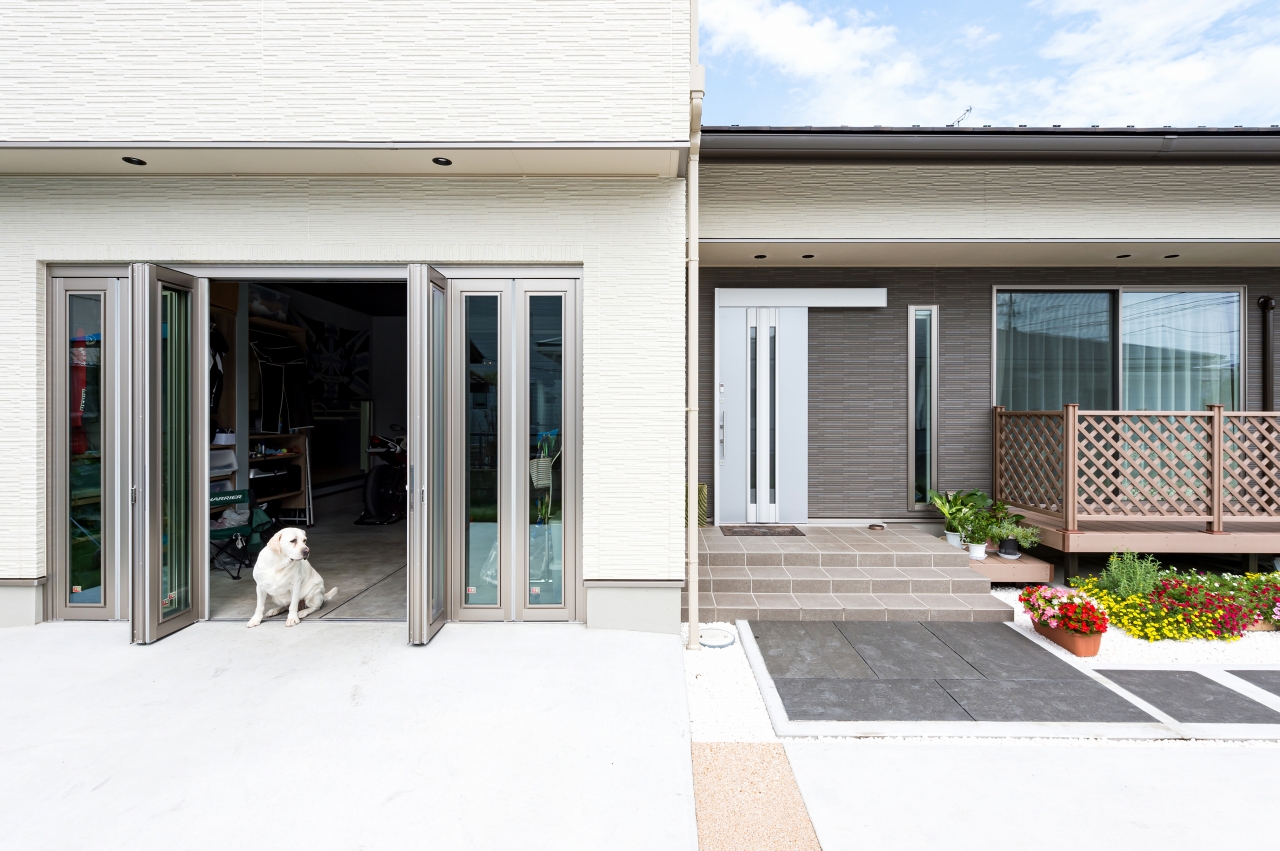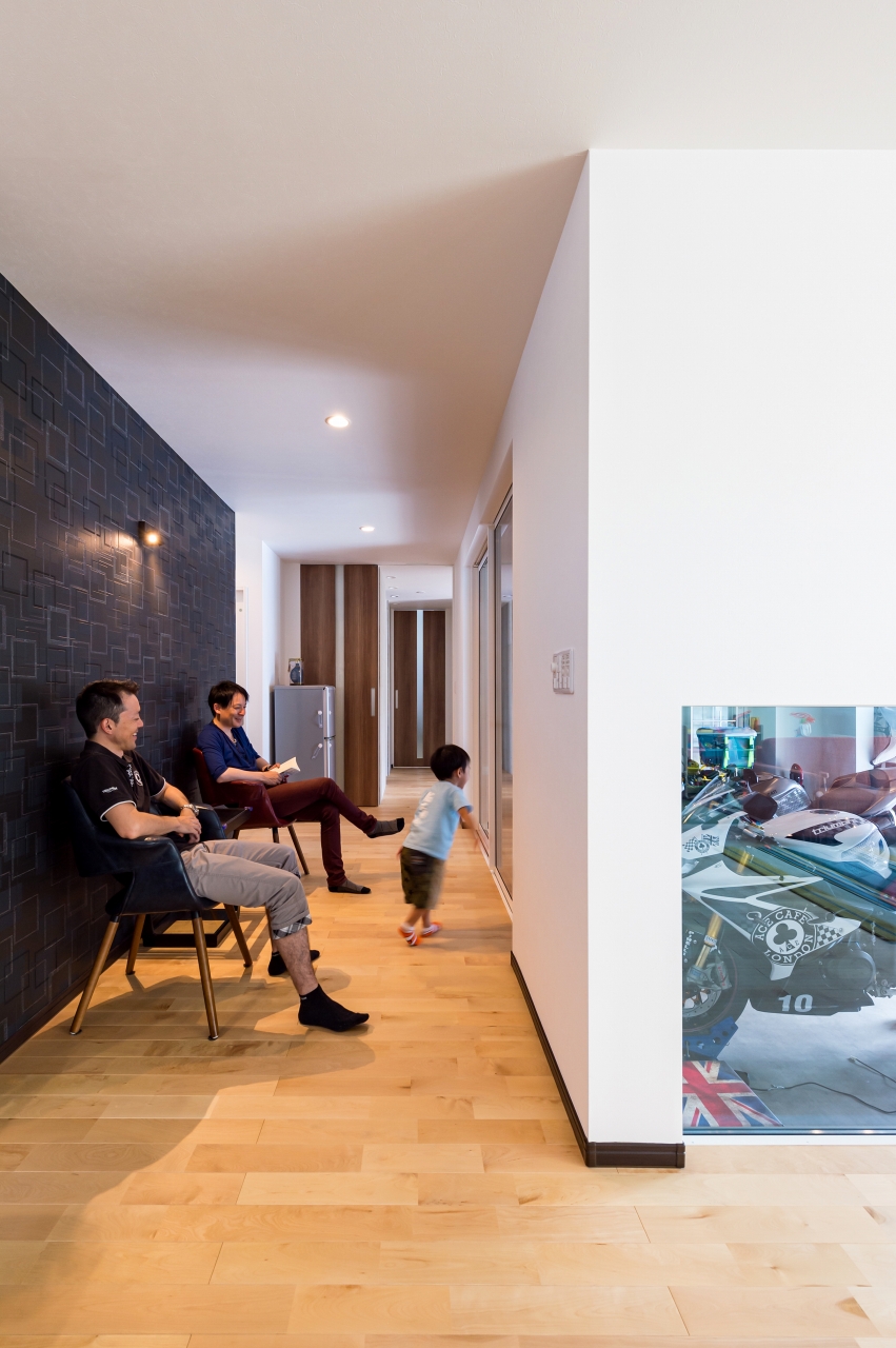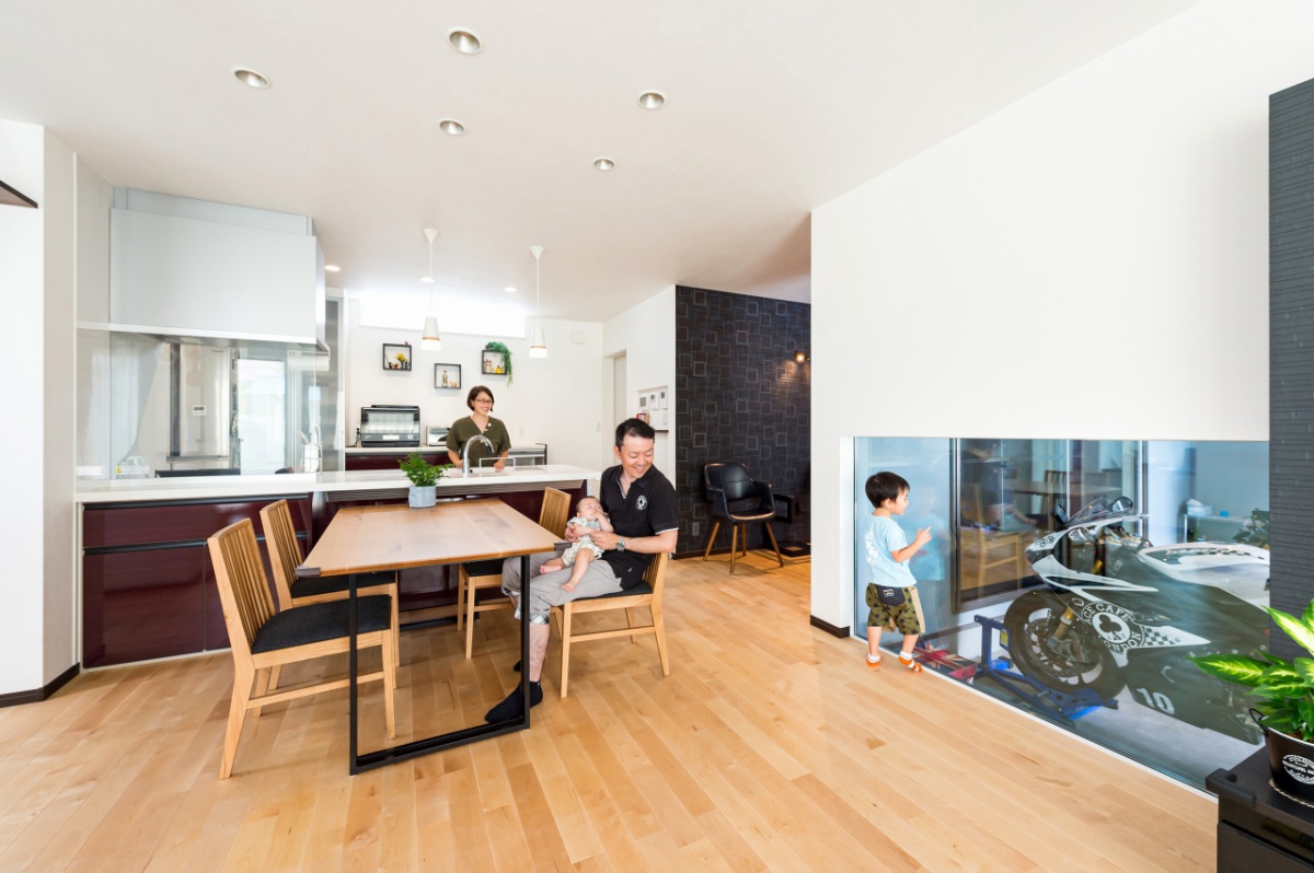 親世帯・子世帯ともに男性陣の趣味であるバイク。Mさま邸はガレージを中心に二世帯住宅の計画が進んでいきました。子世帯の二階建てと親世帯の平屋を組み合わせたオリジナリティあふれるプランは、要望を丁寧に取り入れながら家事動線や自然素材にもこだわり、家族みんなが楽しい住まいになりました。