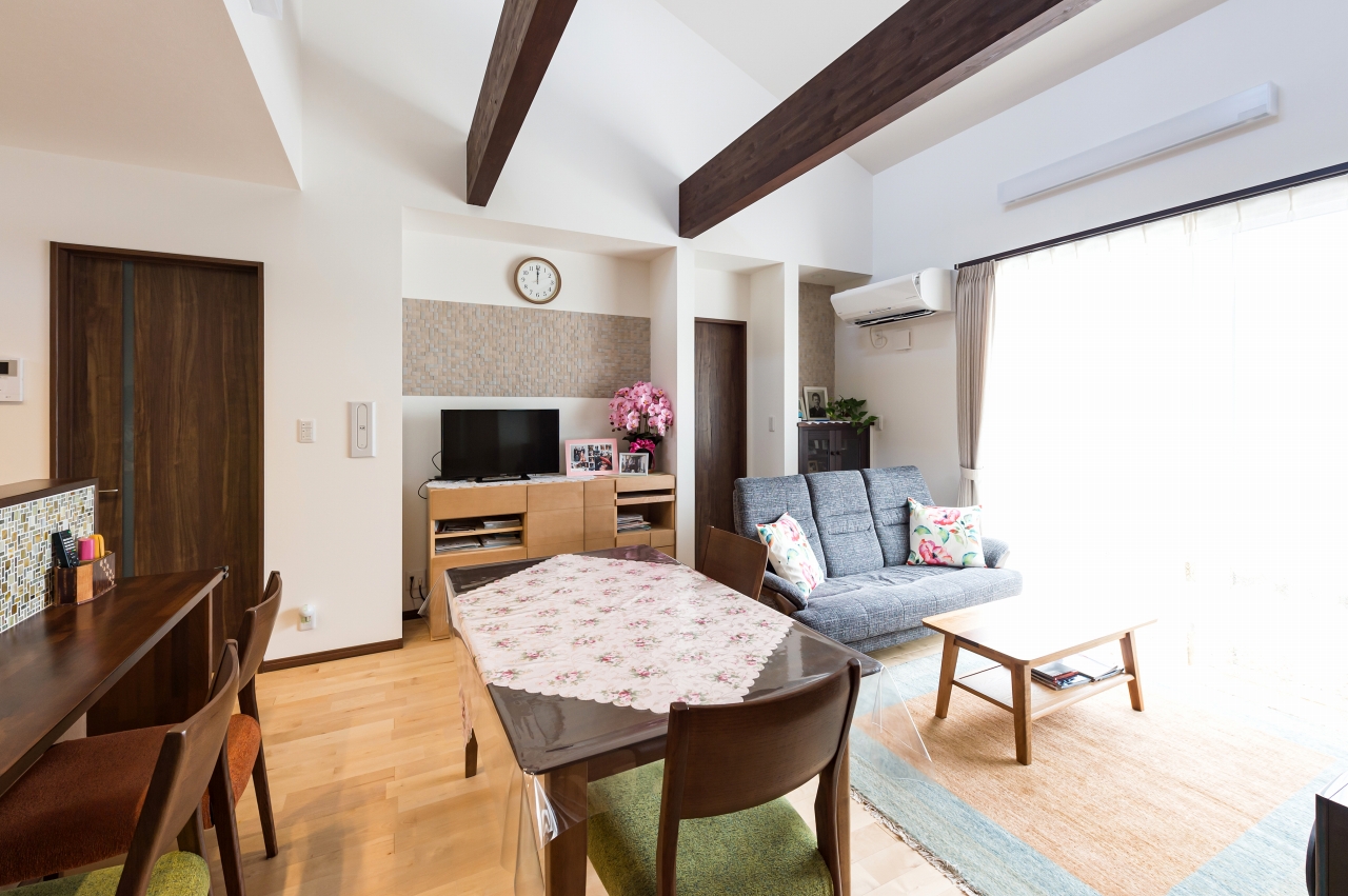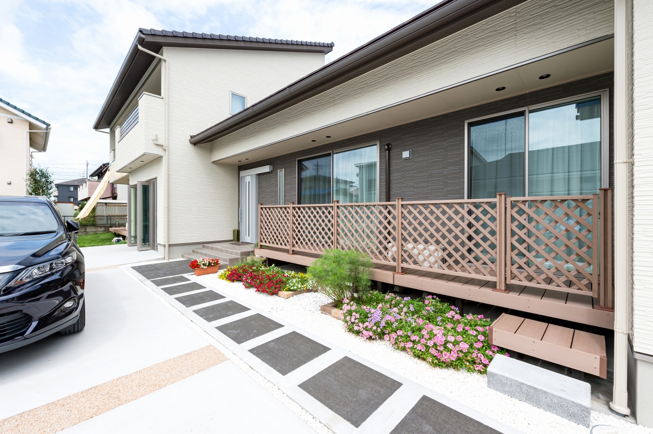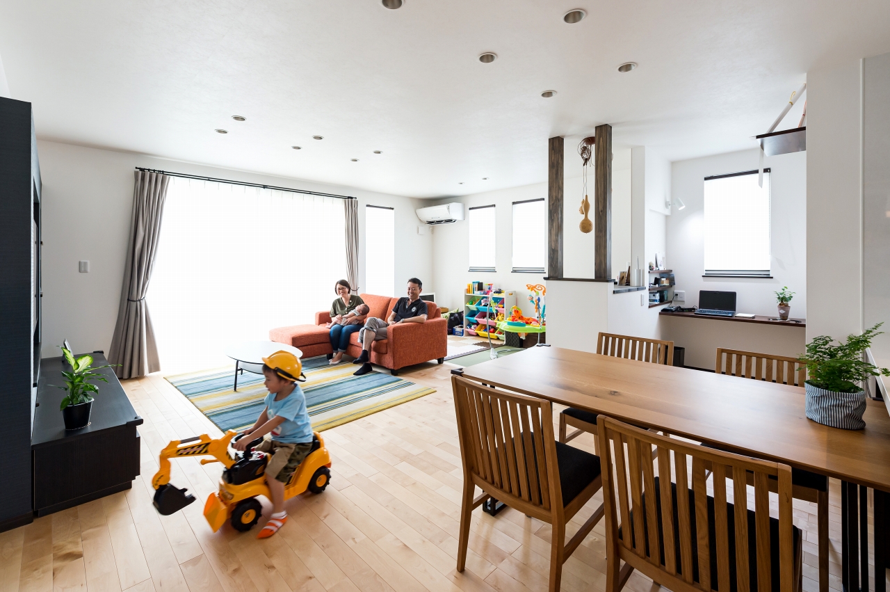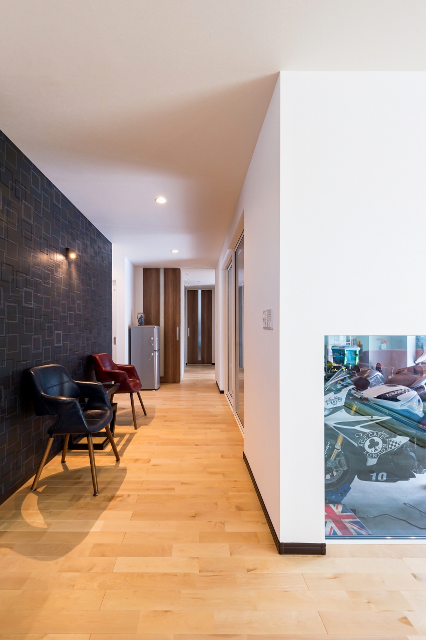 親世帯・子世帯ともに男性陣の趣味であるバイク。Mさま邸はガレージを中心に二世帯住宅の計画が進んでいきました。子世帯の二階建てと親世帯の平屋を組み合わせたオリジナリティあふれるプランは、要望を丁寧に取り入れながら家事動線や自然素材にもこだわり、家族みんなが楽しい住まいになりました。
