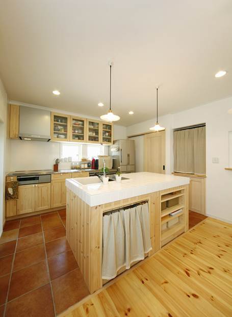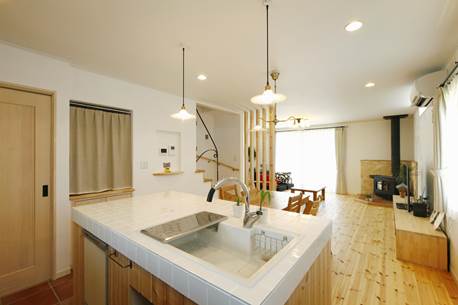 白いホタテ漆喰の壁にキッチンの可愛い白タイル、そしてぬくもりのあふれる無垢材の床。