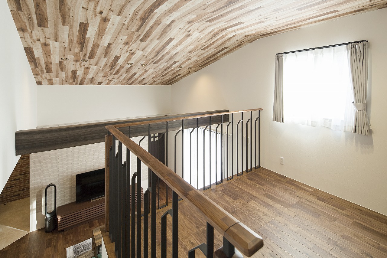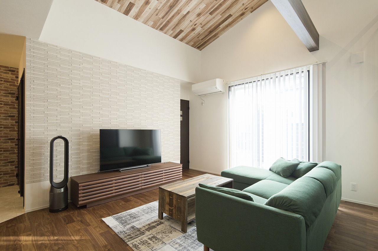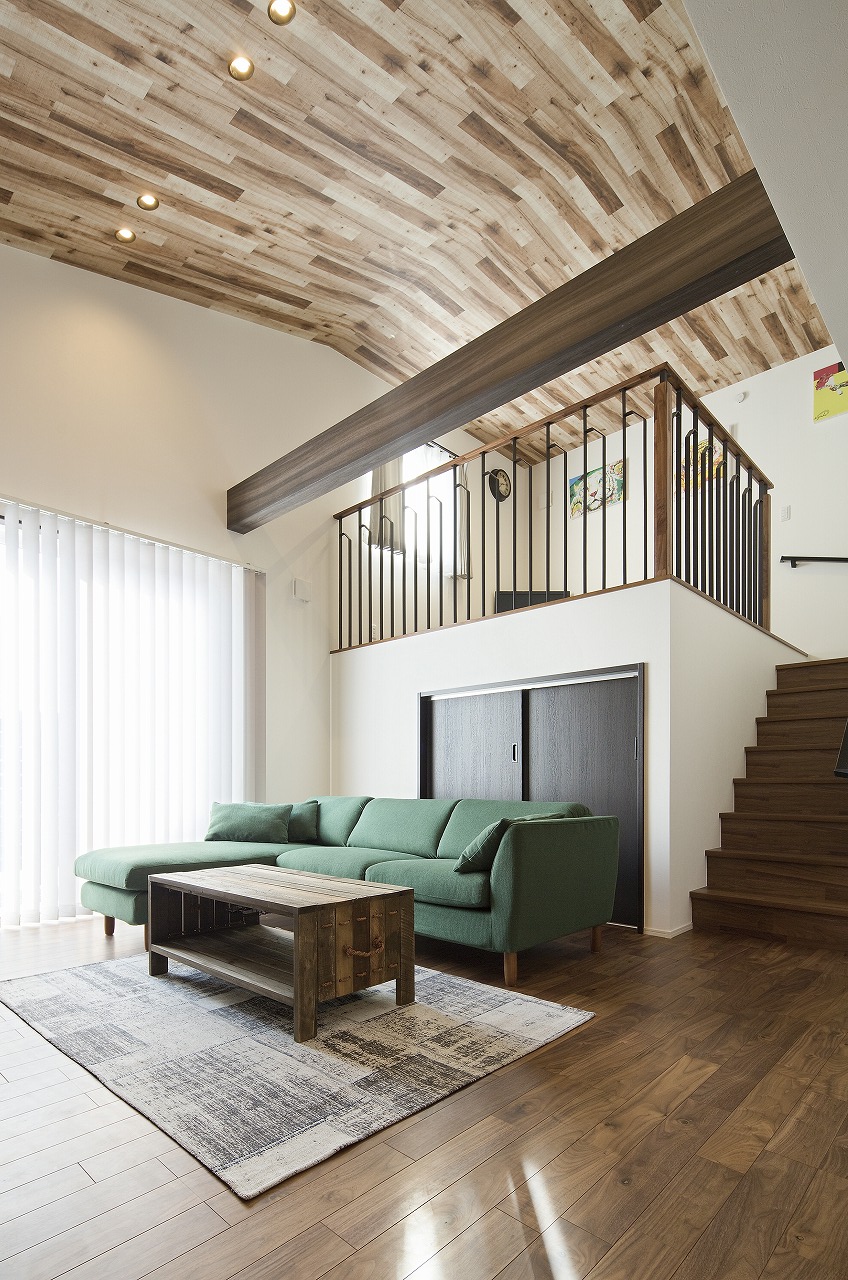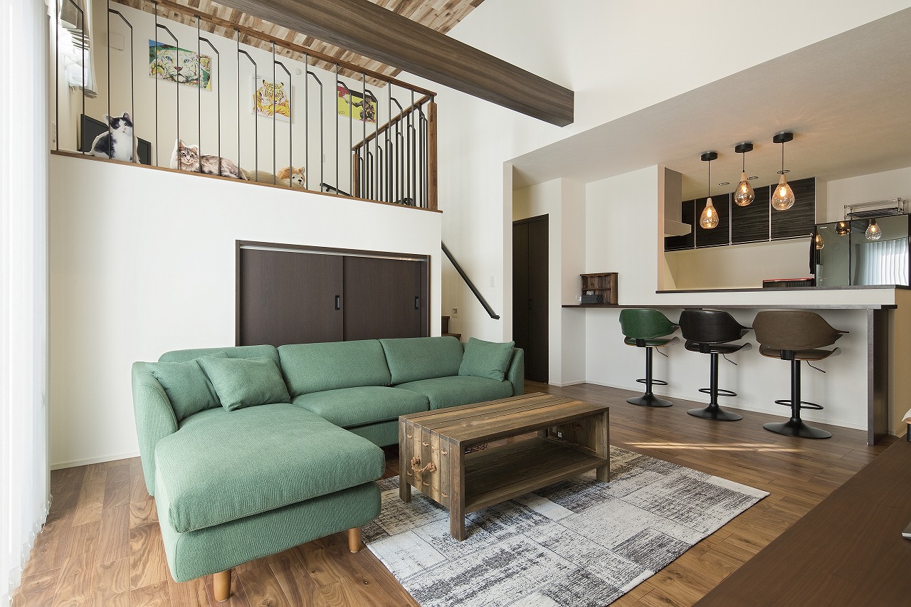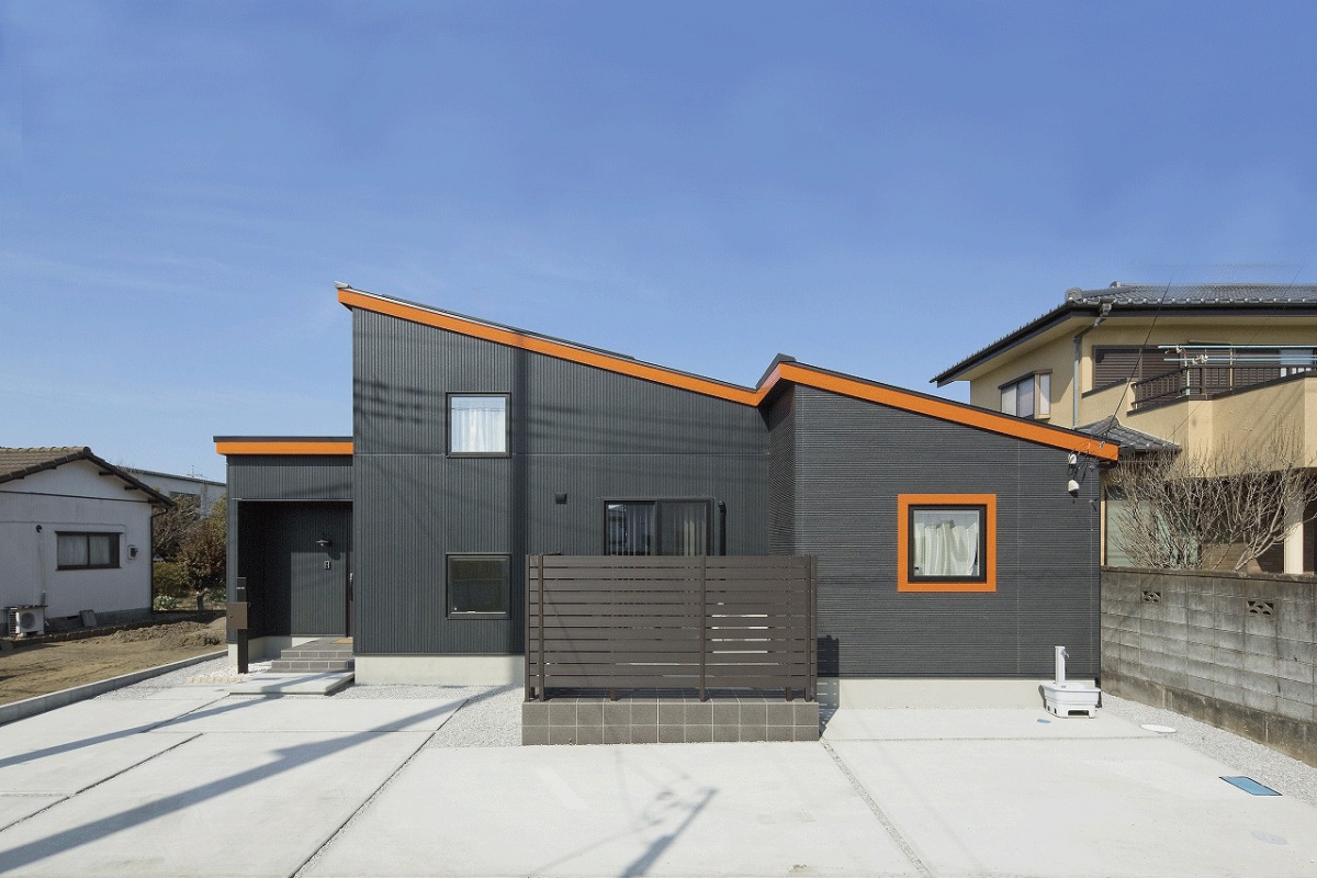 子どもの誕生を機に「大きなお家に住みたい」と家づくりを決意。楽しく使えるスキップフロアを設けた平屋は、「ワンフロアで生活が完結できる暮らしは家族とのコミュニケーションが取りやすいだけでなく、断熱性能が高いのでエアコン一台で快適に暮らせるのがいいですね」とご主人様。デニムのステッチをイメージした、差し色の効いた外観がとても素敵な住まいです。