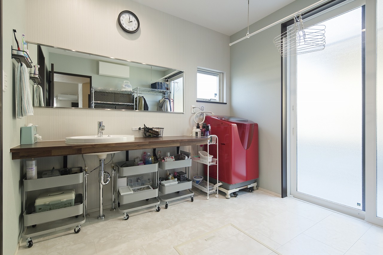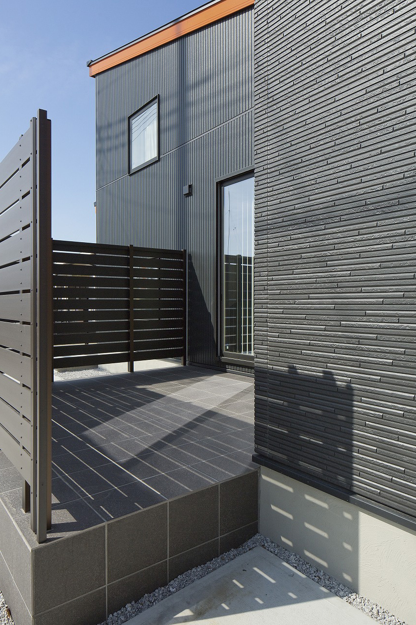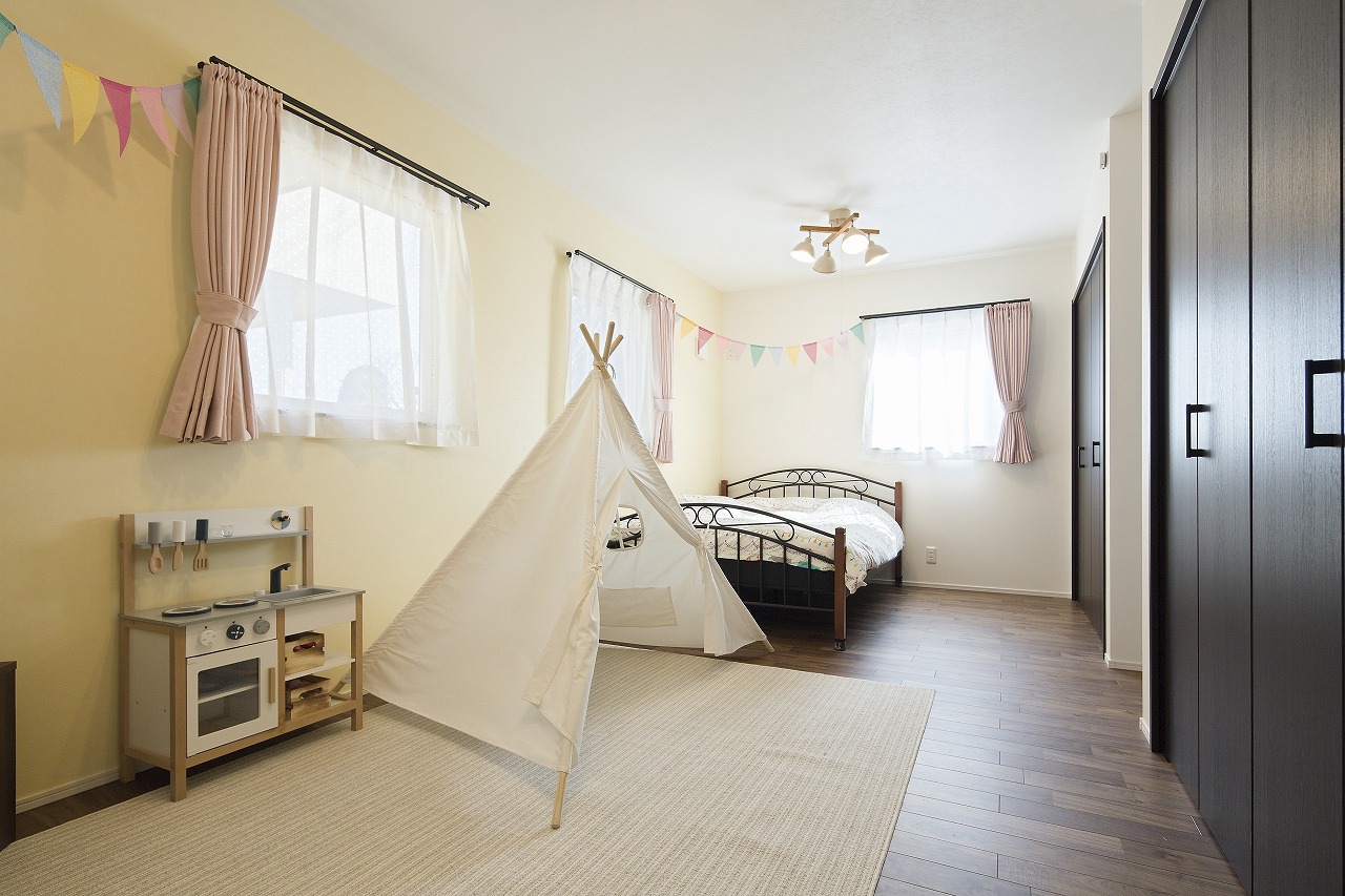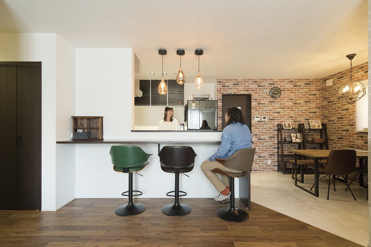 子どもの誕生を機に「大きなお家に住みたい」と家づくりを決意。楽しく使えるスキップフロアを設けた平屋は、「ワンフロアで生活が完結できる暮らしは家族とのコミュニケーションが取りやすいだけでなく、断熱性能が高いのでエアコン一台で快適に暮らせるのがいいですね」とご主人様。デニムのステッチをイメージした、差し色の効いた外観がとても素敵な住まいです。