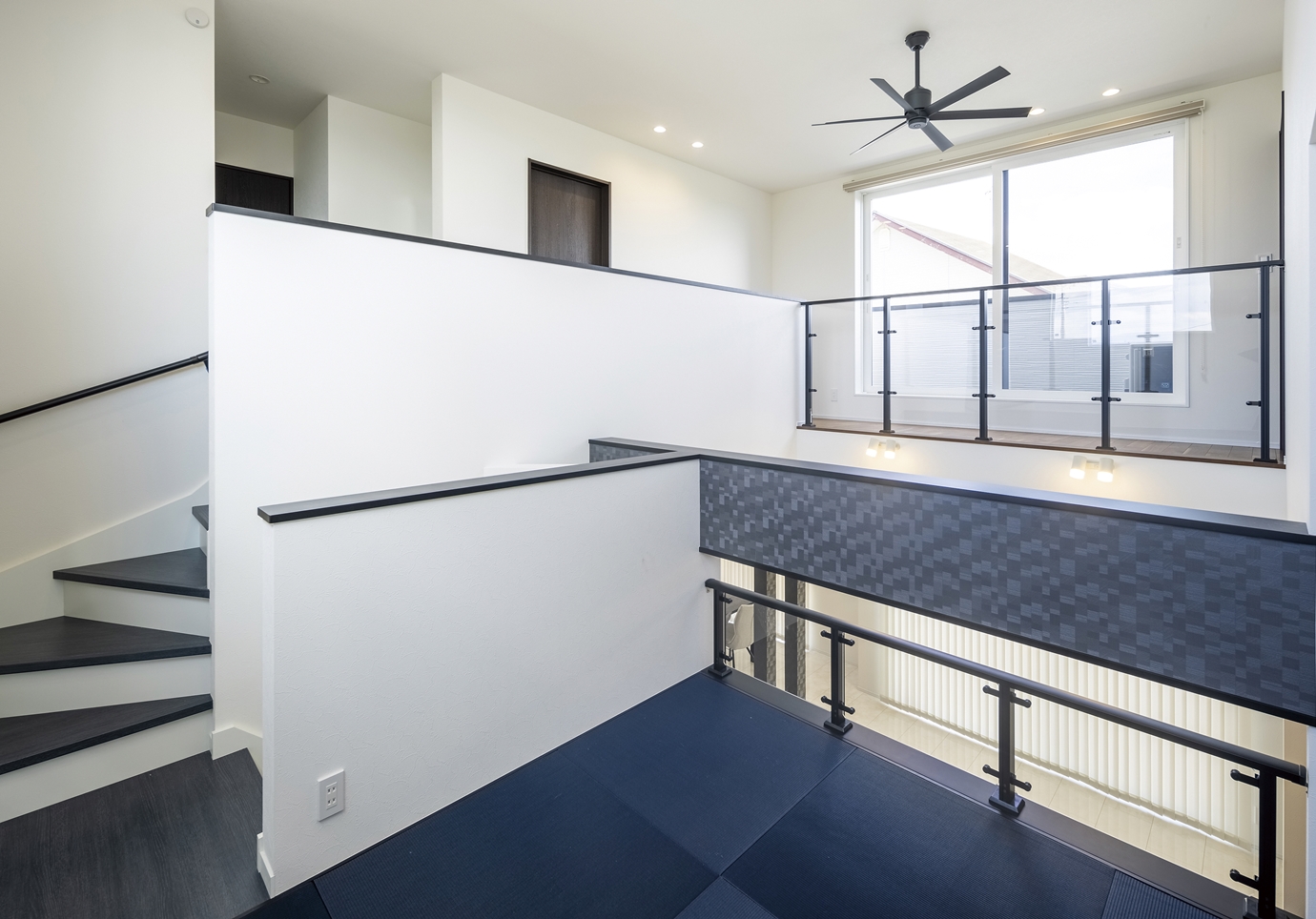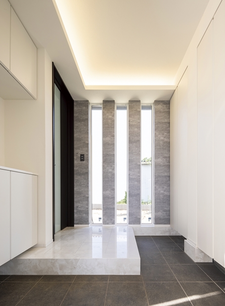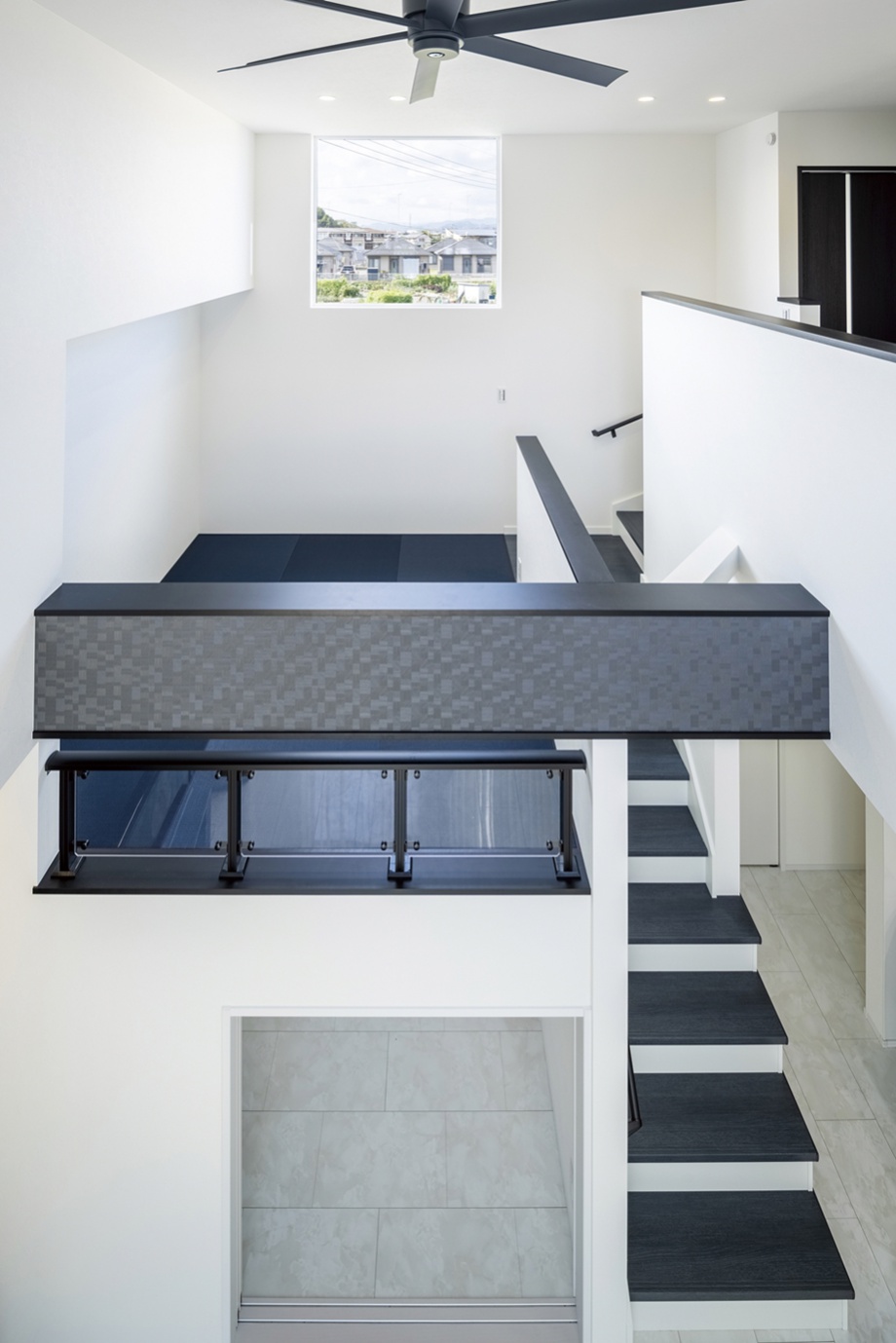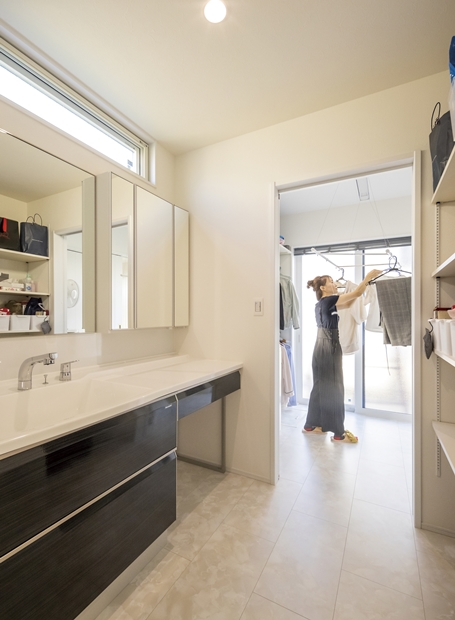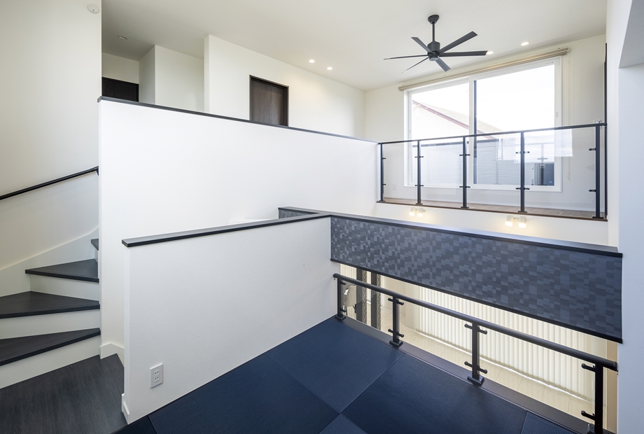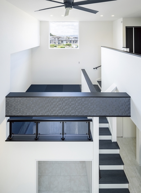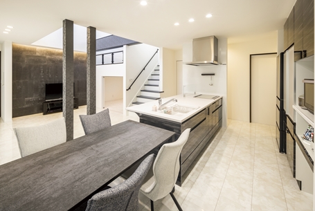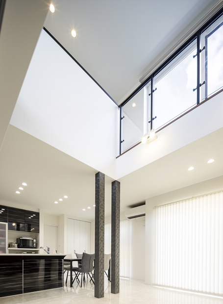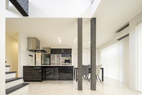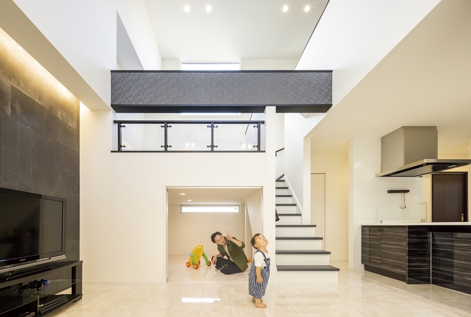 白と黒を基調にしたスタイリッシュでかっこいい家を作るのが希望だったK様。吹き抜けと遊び心溢れるスキップフロアを設けたLDKが特徴的なお家です。奥様お気に入りのランドリールームは「洗濯をしてすぐに外に干せる動線で、家事がラク!」と大変満足なご様子。デザイン、家事動線、スキップフロアや吹き抜け等の空間提案と、魅力満載です。