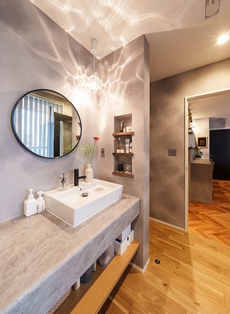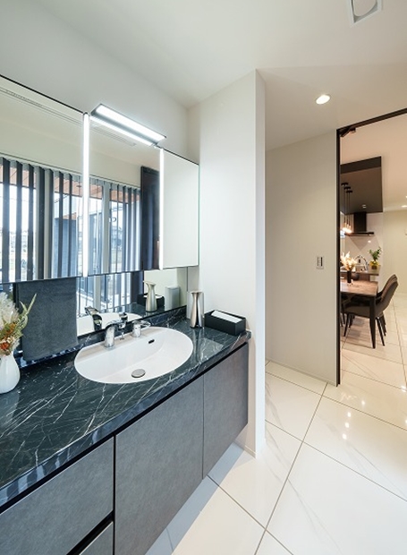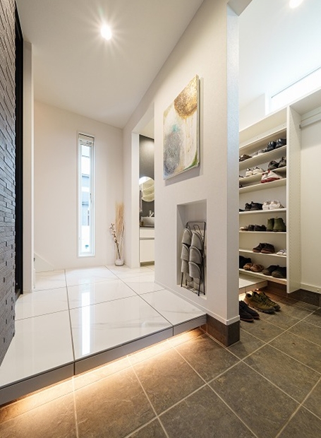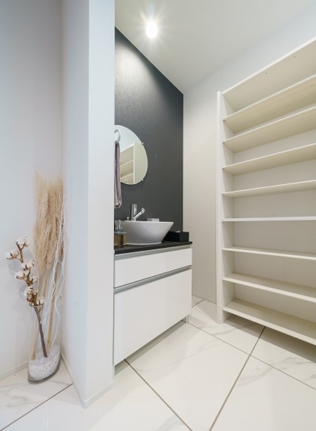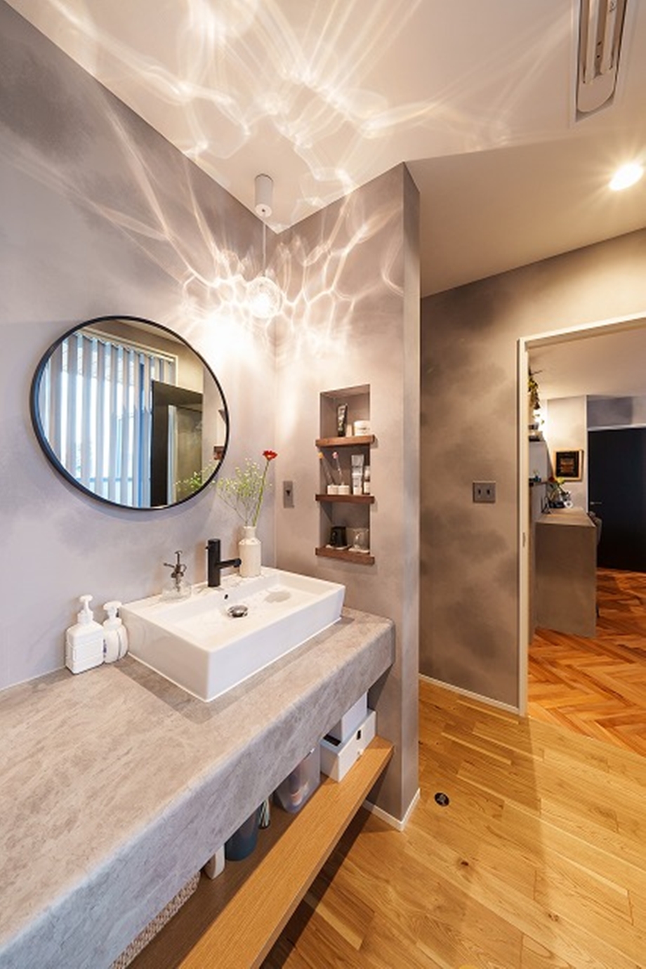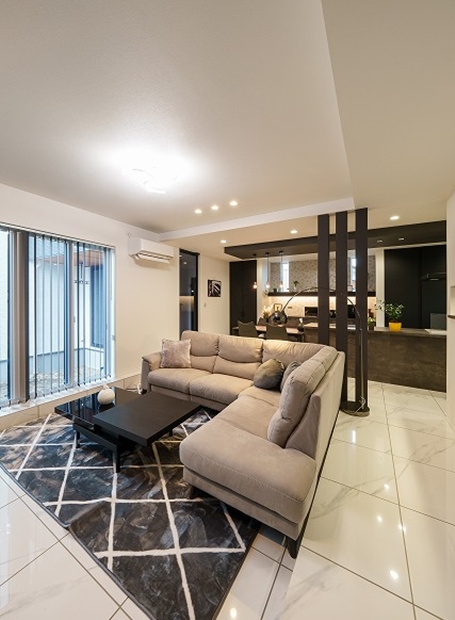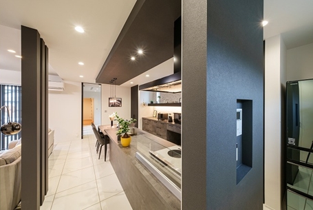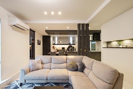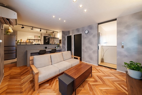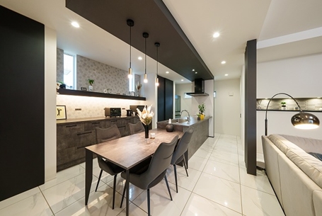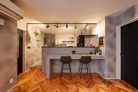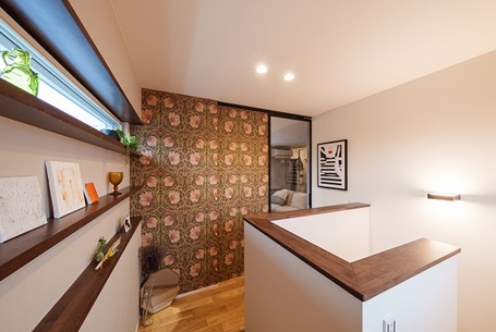 2世帯住宅であるM様邸。1階はモダンでホテルライク、2階は自然素材をたっぷり使用した全くテイストの異なる住宅です。1階建具はハイドアで統一し、壁紙を白で統一。スケルトンで部屋同士が繋がる開放感たっぷりの空間に。2階はインパクトのある輸入壁紙やヘリンボーンの床、モルテックのカフェ風ダイニングなど、素材にこだわりました。