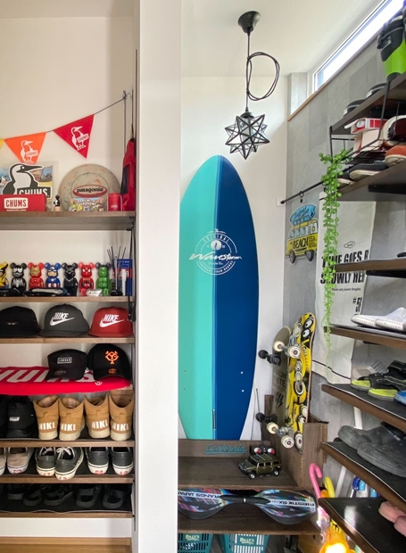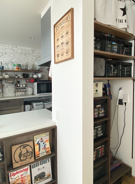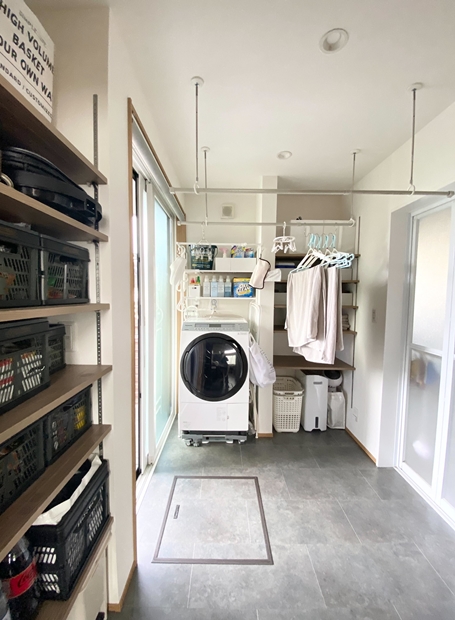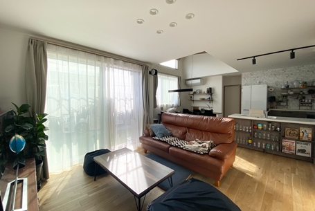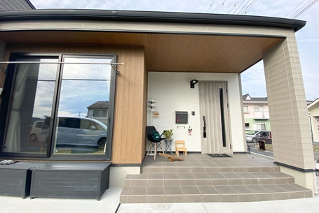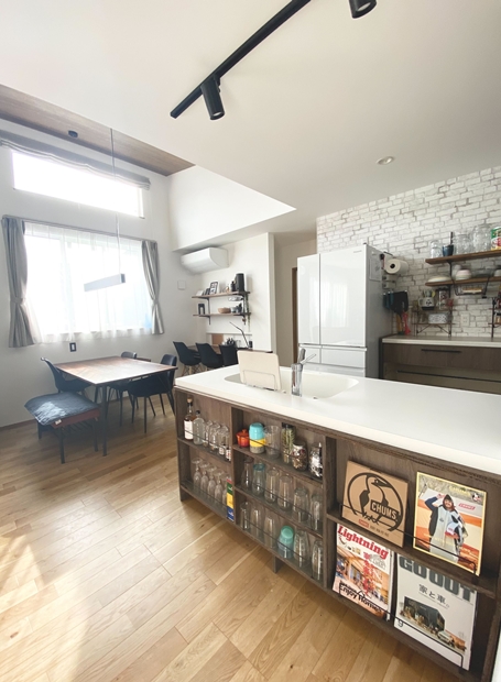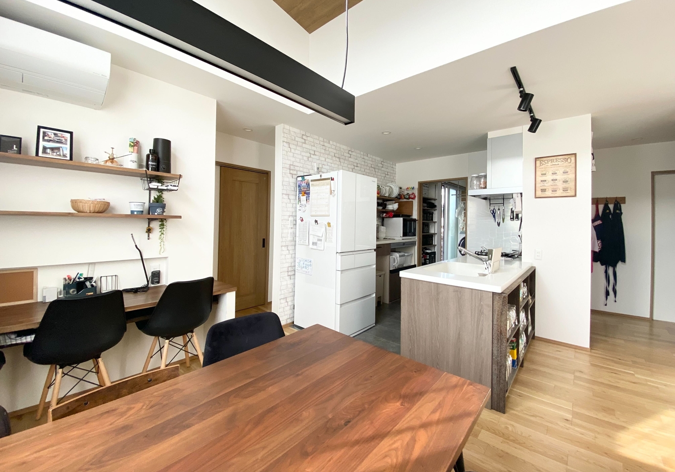 家の中をぐるぐる回れて、どこに行くにも便利な回遊動線のあるT様邸。勾配天井と木目天井のダイニングは高い位置から光が射し込むので明るくて開放感抜群。キッチン前のマガジンラック、宿題やテレワークができるワークスペース、学校や会社の手紙や書類が収納できる棚など、家族全員が快適に暮らせる工夫がたっぷりの平屋です。