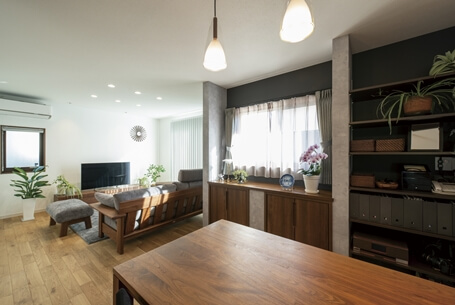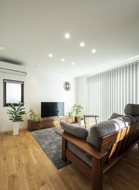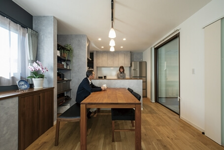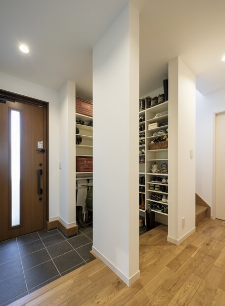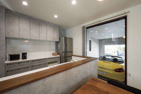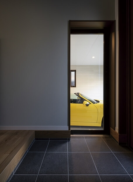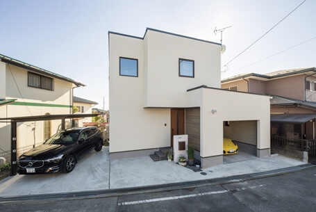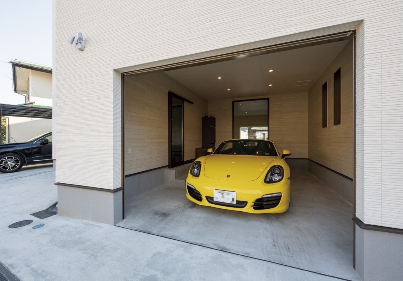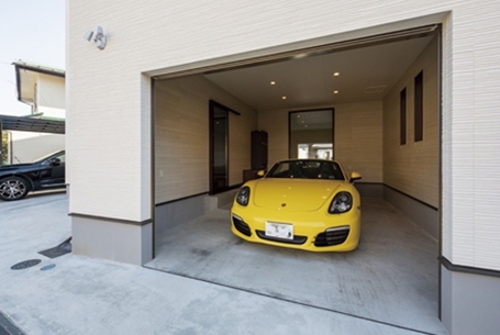 ボックスを組み合わせたデザインの外観に、大事な車を雨風光から守るビルトインガレージのあるS様邸。自動シャッターは毎日のお出かけや車の撮影、メンテナンス時にも片手で使いやすく、車を降りた後はそのまま玄関に入れるので雨の日やたくさんの買い物時に便利です。また、リビングからはガレージが常に見え、より身近に愛車を感じられます。ドライブも楽しみになりますね。