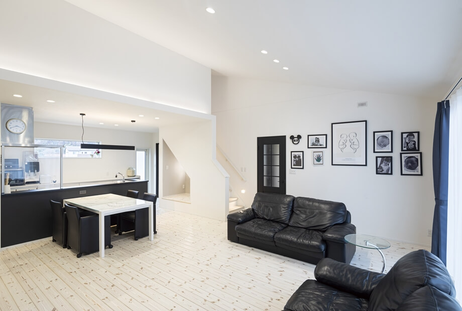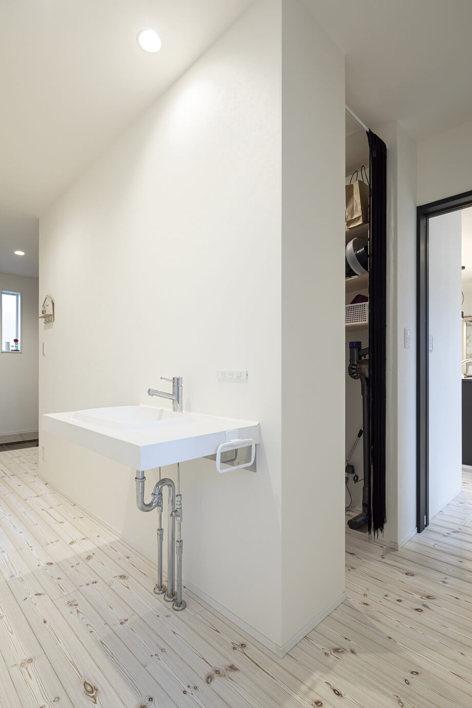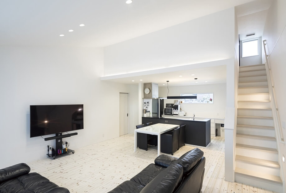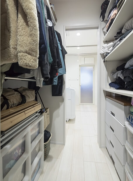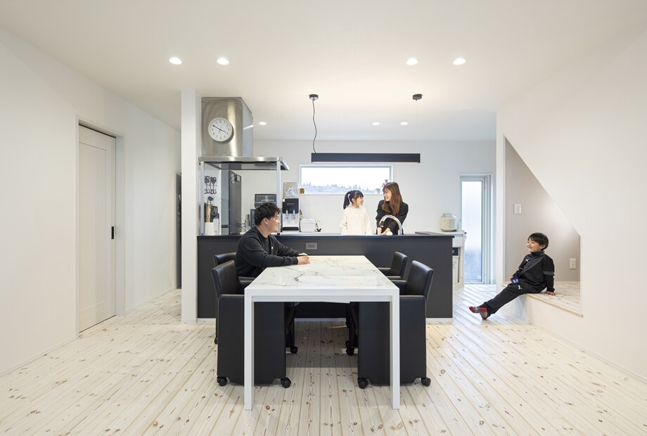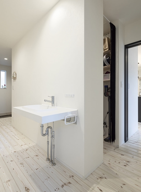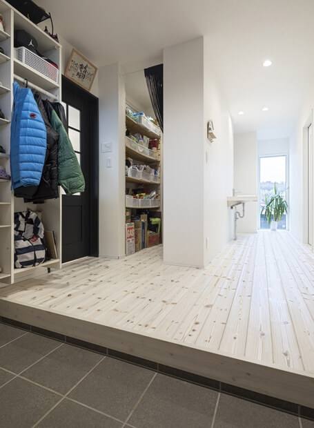 使い勝手の良い家事動線を実現した、冬も夏も快適に過ごせる平屋のY様邸。玄関はすぐに靴やコートが取り出せるオープン収納を付け、明るく視線が抜ける広めの空間にし、帰宅後すぐ手洗いうがいができる洗面を配置しました。買い物後はパントリーにそのまま荷物を収納してキッチンへ抜けられるように。キッチンは回遊できるタイプを選択し、ランドリールームとファミリークロークへ繋がります。家事動線と断熱性能に優れた、エアコン1台で1年中快適に過ごせるおうちです。