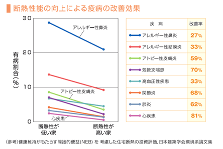 断熱性能を高めることで室温の高低差が生まれにくくなるので、ヒートショック、呼吸器系疾患など冷えから起こる健康リスクを抑制することができます。