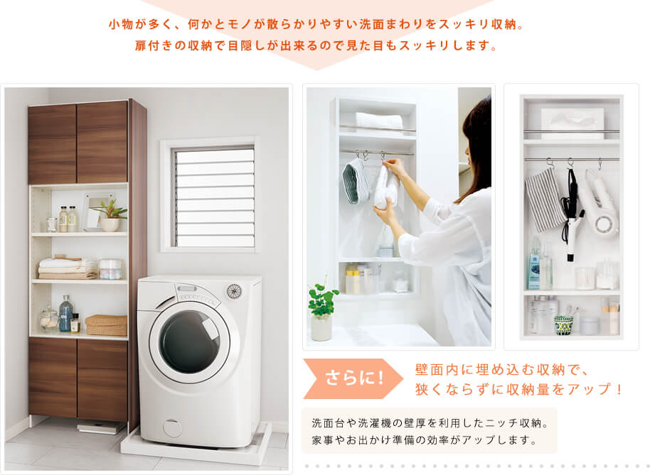 タオル類や洗剤などのストックを一括してしまえる収納を考えましょう。
