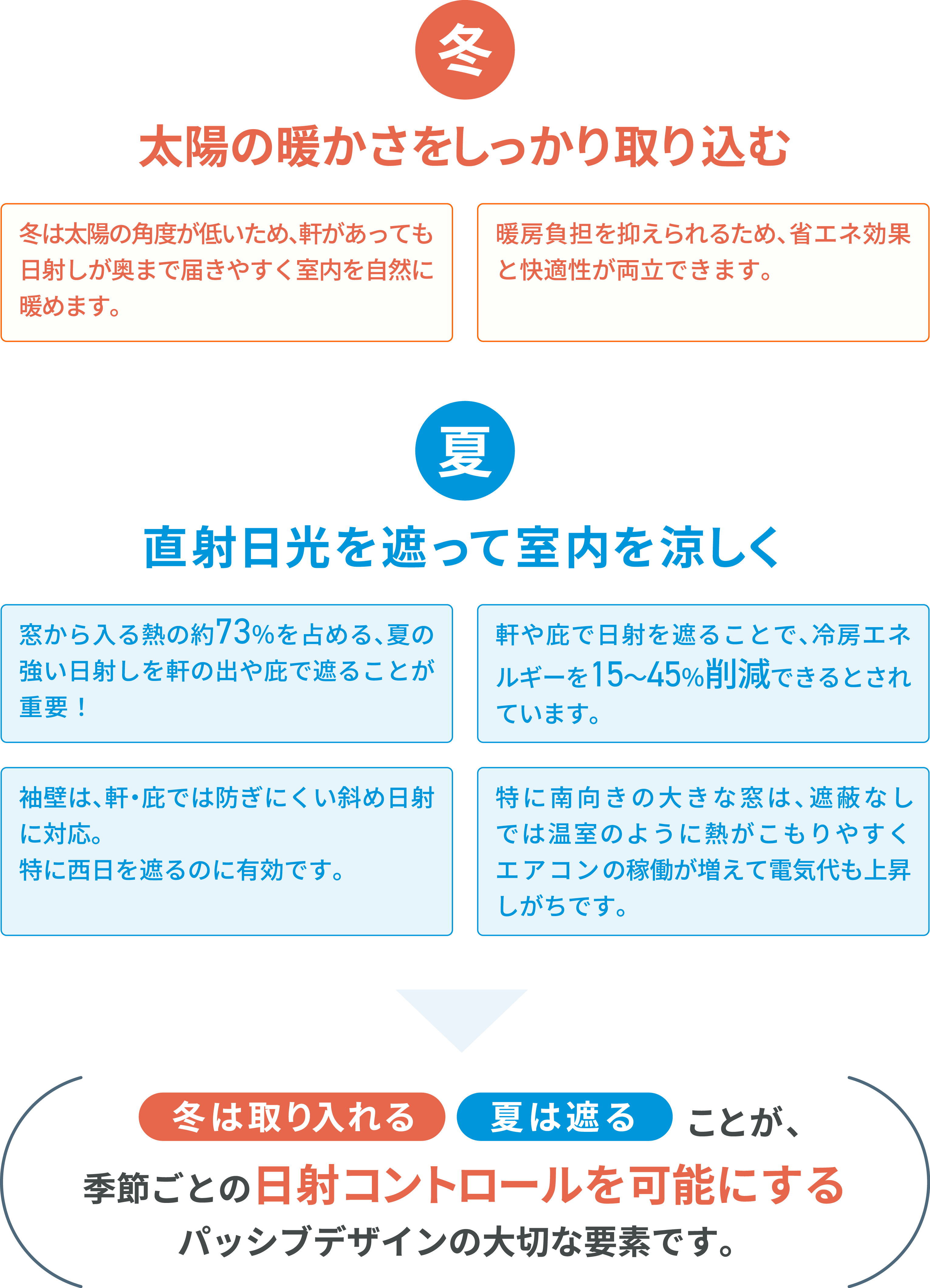 ※パッシブデザイン: 太陽の光や風など自然の力を活かして、快適な住環境をつくる家づくりの考え方です。