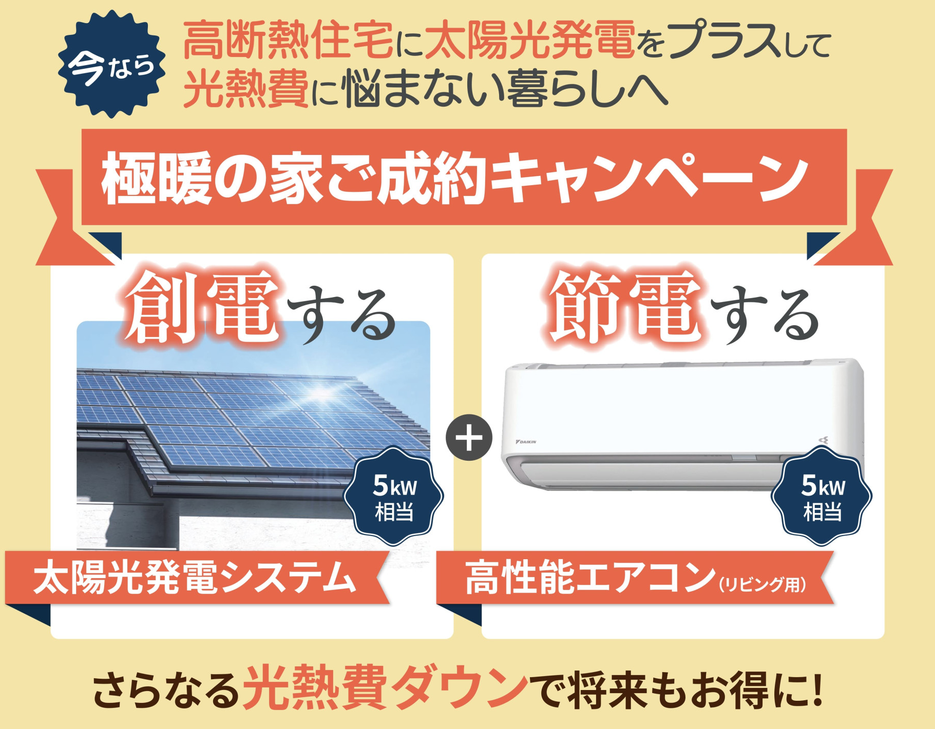 ※キャンペーン対象商品は「極暖の家」 「極暖の家FIT」 「極暖の家Premium」に限ります。※期間中に新規ご契約いただき、契約後1年以内にお引き渡しの方が対象となります。※当社施工エリア内にご建築いただける方、完成見学会や雑誌掲載などの広報活動にご協力いただける方が対象となります。※解約時には無効となりますのでご了承ください。※ほかのキャンペーンとの併用はできません。※既にご契約済みのお客様、リフォーム・建売物件は対象外となります。※在庫状況、メーカー側の都合によりアイテムが変更となる場合があります。※ご契約後の商品変更、キャンペーンの内容変更はできません。※詳しくは展示場スタッフまでお問い合わせください。※写真はすべてイメージです。