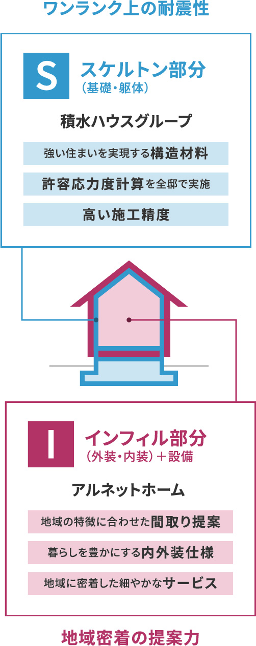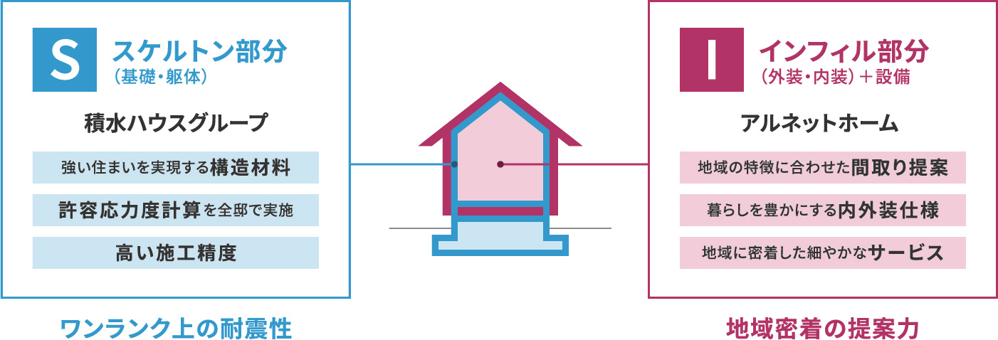 SI-COLLABORATIONとは、木造住宅のスケルトン部分(基礎・構造躯体)を積水ハウスグループが設計・施工して、アルネットホームがインフィル部分(外装・内装・設備)を施工することで、両者の優れた部分を掛け合わせた新しい住まいづくりの選択肢です。